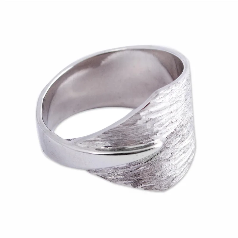 Mexico's Diana Solis gives this band ring an elegant, modern design, featuring warping triangle shapes with a striking combination of finishes. Working with her children, the artisan crafts this ring of sterling silver.