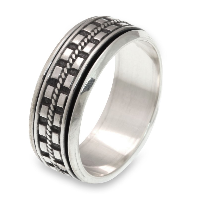 Polished sterling silver is complemented by deep oxidized nuances in this handsome ring for men. Komang Suastra of Bali designs and crafts this spinner or meditation ring by hand. Intended to invoke a meditative or peaceful state of mind, the inner band spins freely as desired within the outer band.