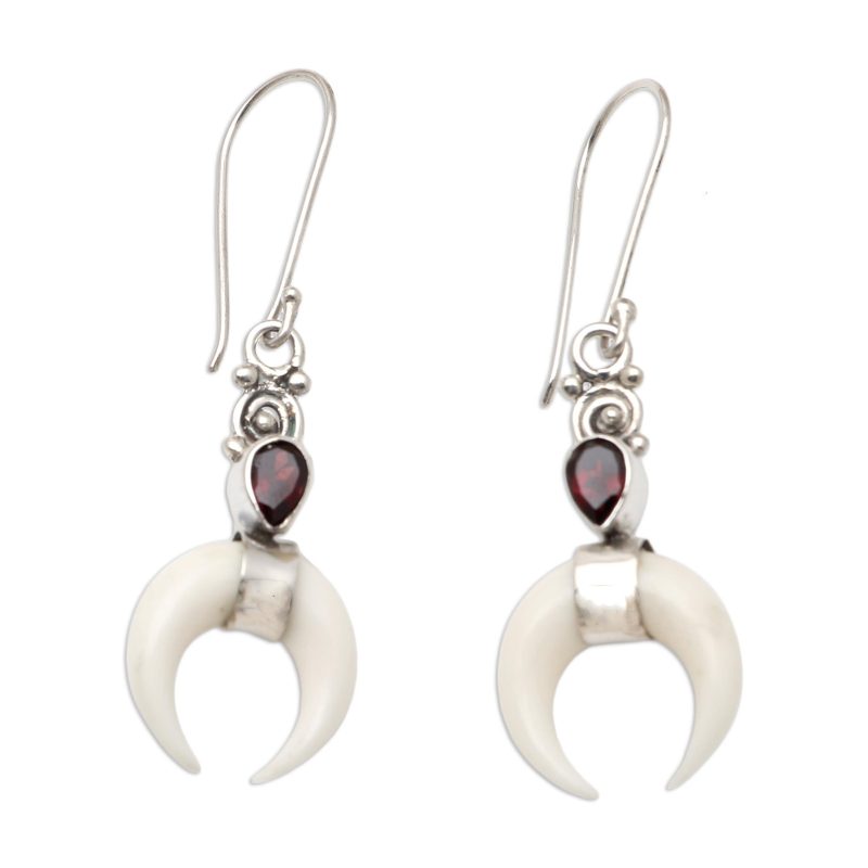 Using the crescent moon as inspiration, Made Wardika designs a pair of truly alluring earrings. The Balinese artisan hand carves a piece of pale bone into a graceful crescent, then accents his creation with a blood-red garnet gem in a bezel setting. Sterling silver accents shine beautifully, like the moon in the night sky.