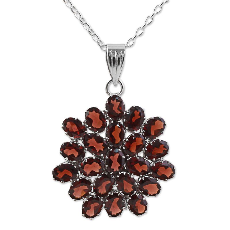 Hanging from a sterling silver chain, this handcrafted pendant features 22 carats of garnets with a red glow. Crafted in the shape of a sunflower, this necklace, presented by India's Alok Jain, captures the complexity of nature.