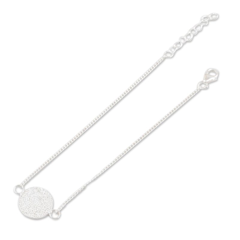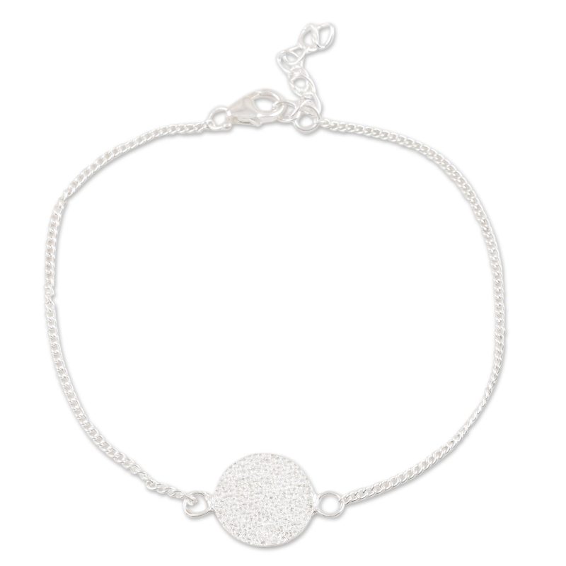 Designed by Indian artisan Neetu Barathi, this sweet bracelet is perfect for everyday wear. The bracelet features a single flat, disk-shaped pendant that shines on a sleek sterling silver Cuban link chain. The artisan finishes the bracelet with a lobster claw clasp and an adjustable fit.