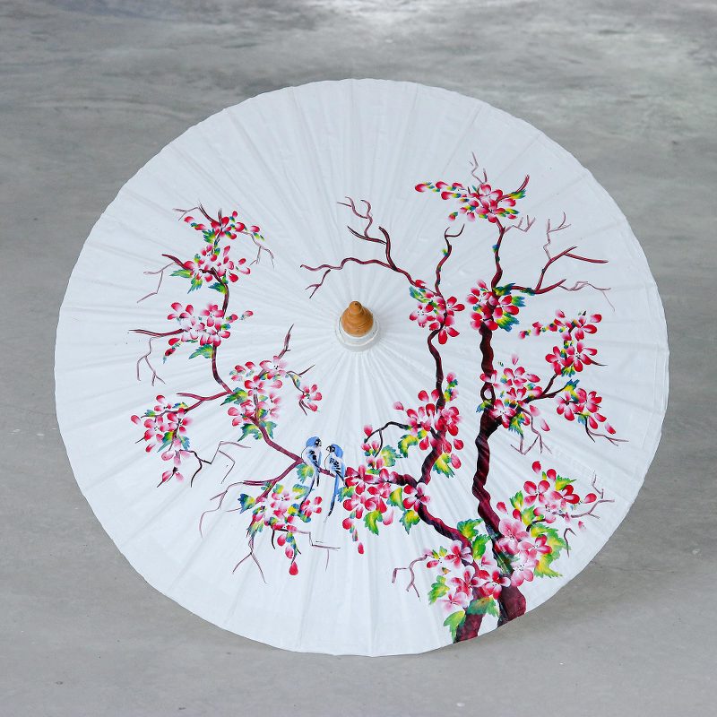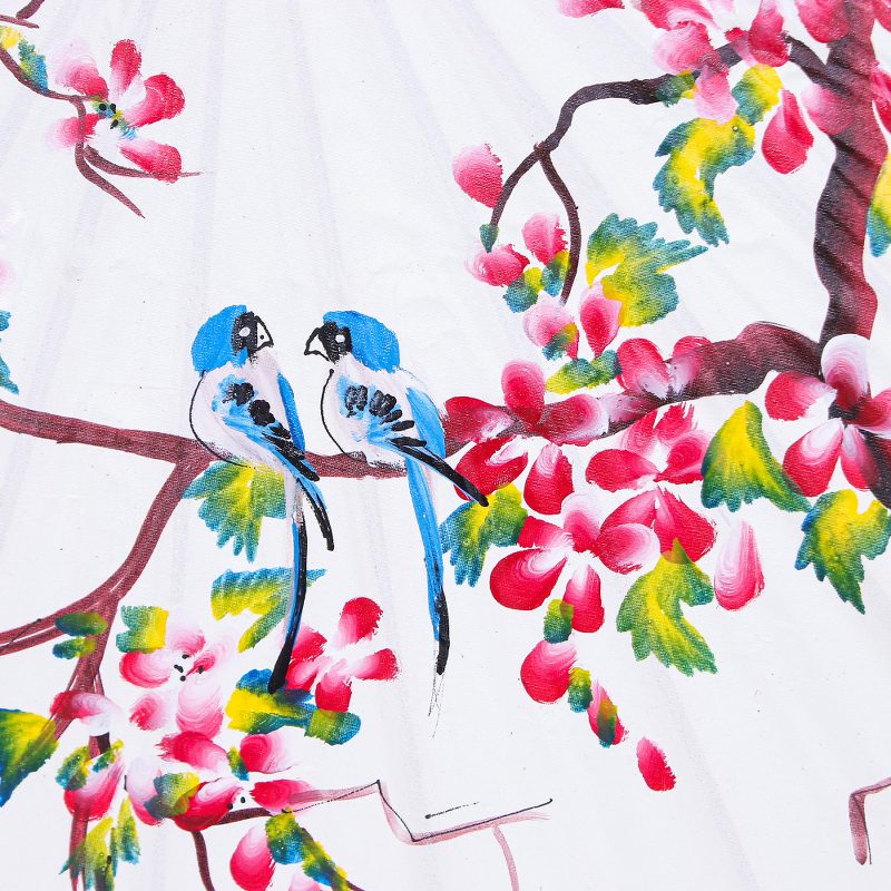 Backed by our 100% Happiness GuaranteeHand-painted with pretty pink blossoms, Nikom's lovely parasol adds charm style to an otherwise drab room. The Thai artisan stretches 100% cotton over a sturdy bamboo frame before painting the fabric with blue birds who perch on the branches of a flowering tree.