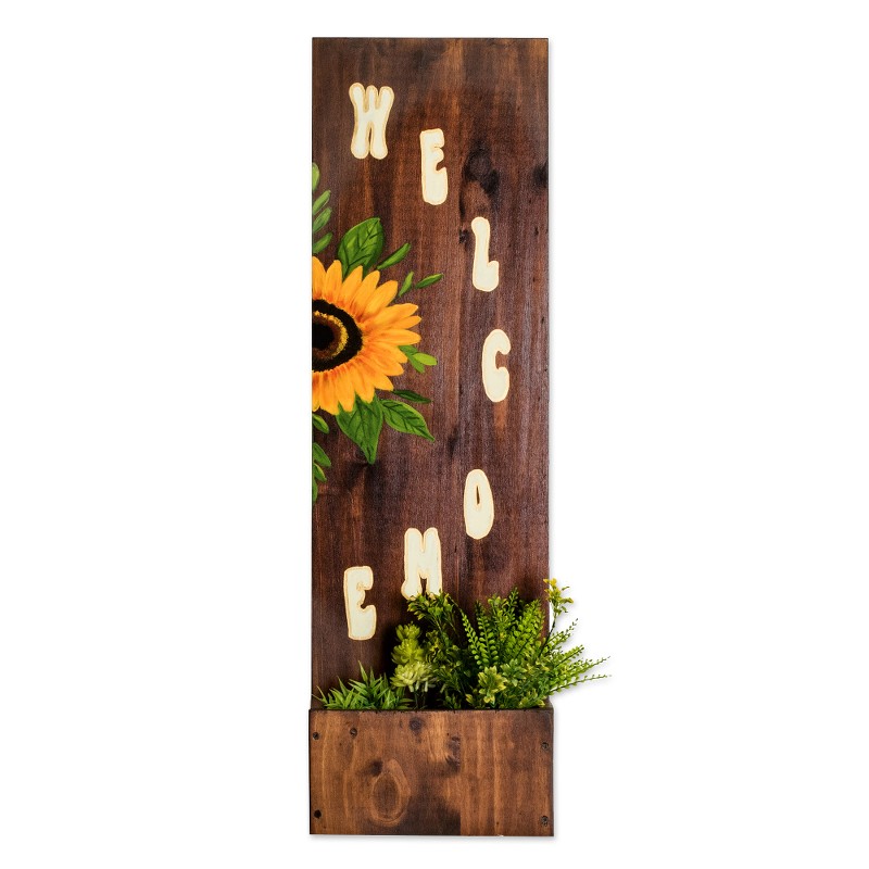 Backed by our Happiness GuaranteeThis splendid decorative home accent adds pops of vibrant floral cheer with its hand-painted whimsical sunflower and leaf motif. Handcrafted from pinewood by Costa Rica's Jessica Brenes, it delivers a warm "Welcome" message in Spanish alongside a convenient box for planters, storage and more. With its stylish and practical design, this lovely handmade accessory will brighten any space.