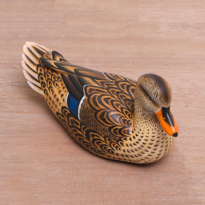 Perfect for animal lovers and bird enthusiasts alike, this stunning sculpture depicts a lifelike female mallard swimming gracefully. "From an early age I loved natural things – plants, animals, birds or sea life... I particularly want to create wildlife and other animal themes in an exact, realistic and original way," Nengah Suarsana explains. He hand-carves the delightful duck from albesia wood, which he then paints by hand in amazing detail.