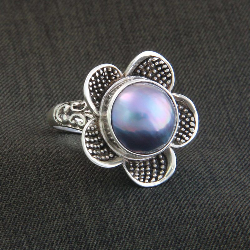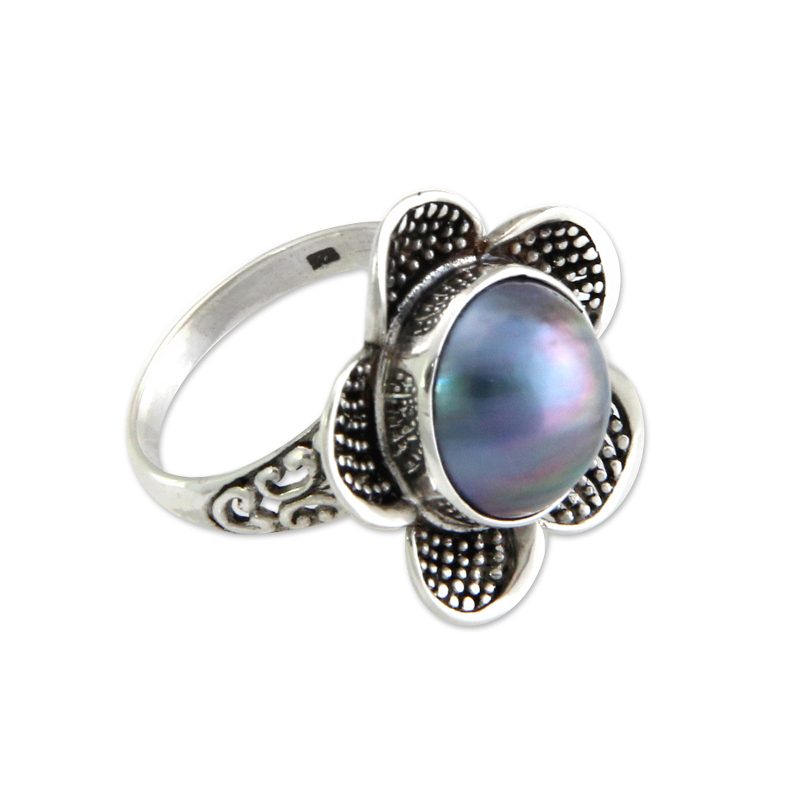 Sterling silver embraces the luminous beauty of a blue pearl hemisphere. Adorned with Bali's legendary silver granules, the petals bloom as jasmine. Komang Wijayana crafts this stunning ring.