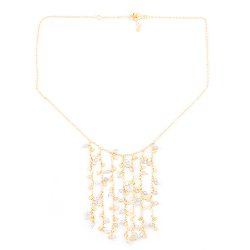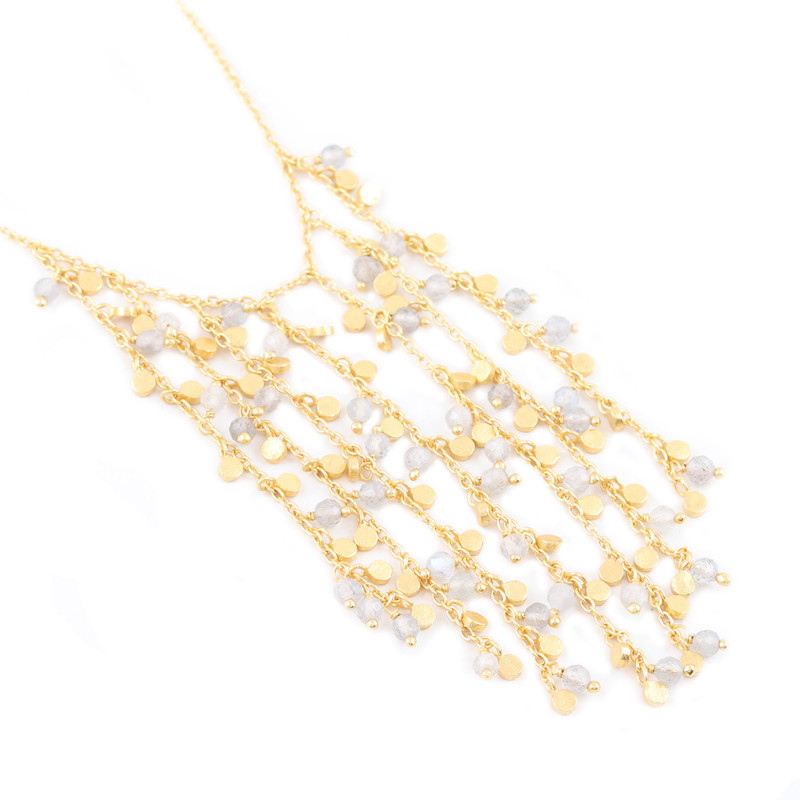 Designed to cascade over your collarbone, Neetu Barathi's waterfall necklace is a luxe treat for a special occasion. Indian artisans use 18k gold-plated sterling silver to hand craft the waterfall pendant, accenting the dangling cable chains with gold-plated beads and shimmering labradorite gems.