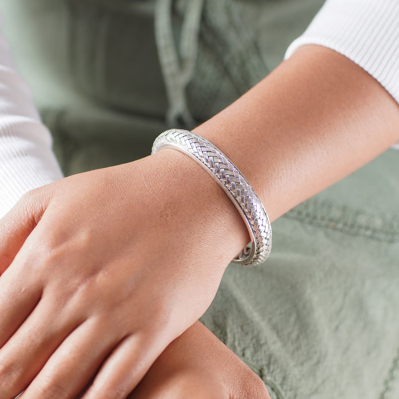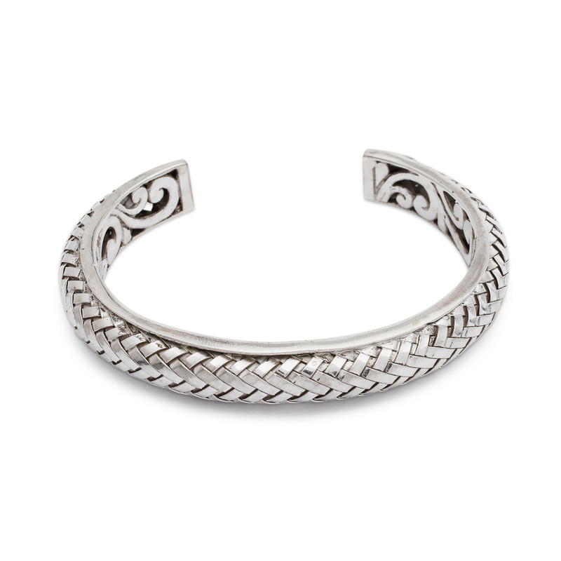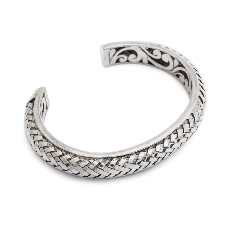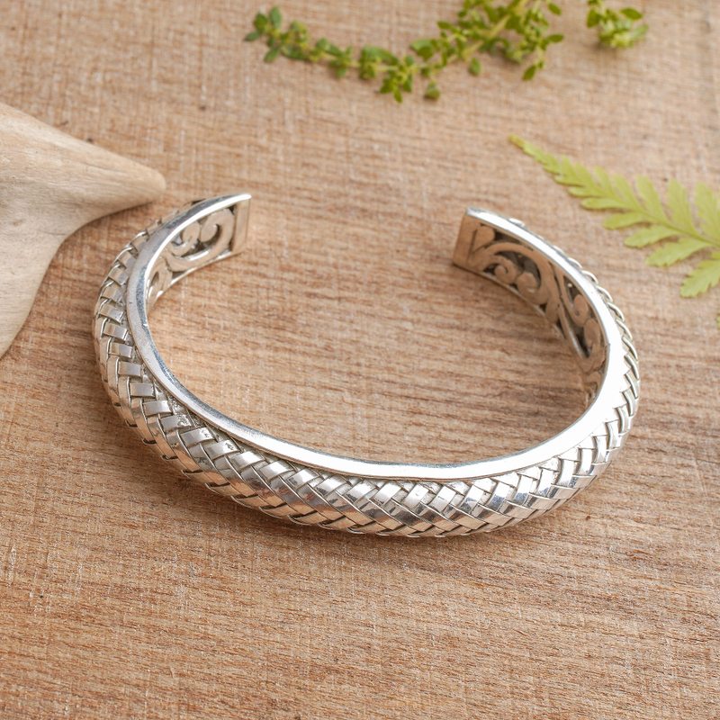 Komang Suastra of Indonesia handcrafts this striking cuff bracelet. Using sterling silver strands, the Balinese artisan creates a woven design on the exterior and a swirling vine pattern on the inner surface. Unique and classy, the bracelet will add an exotic flavor to your collection.