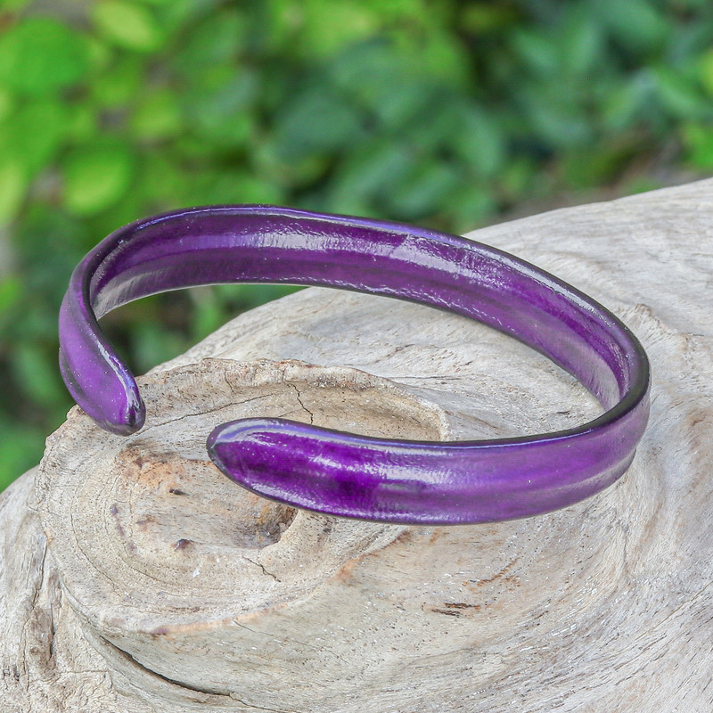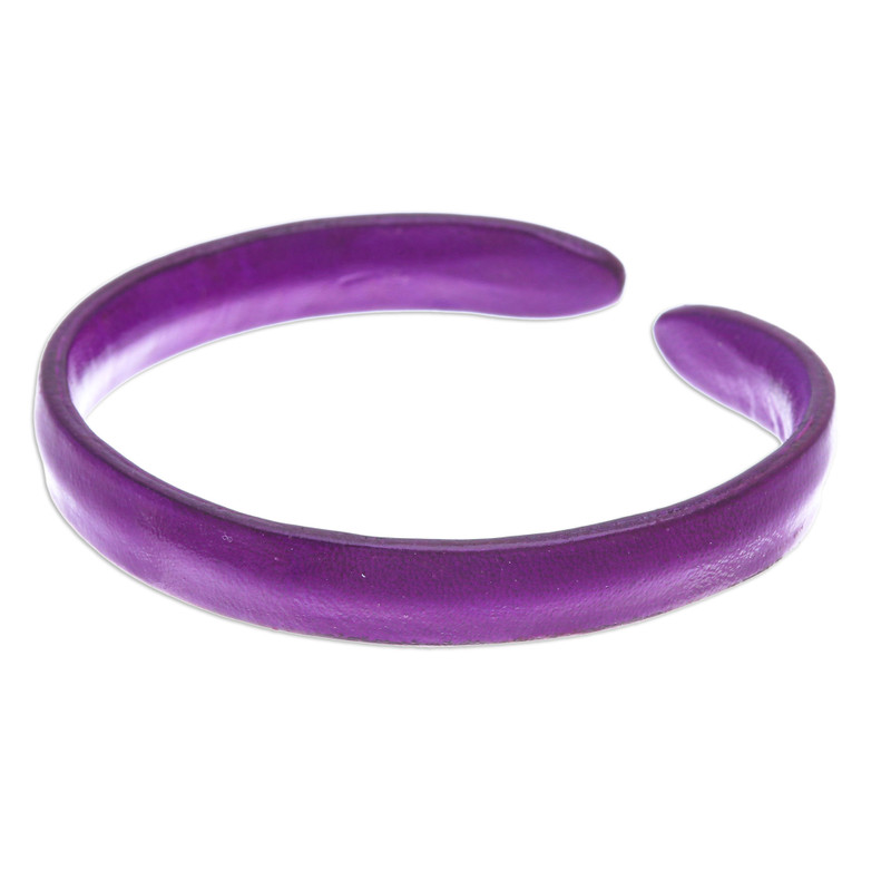 Backed by our 100% Happiness GuaranteeIf your soul vibrates to the tune of creative and mystic emotions, Chang's newest accessory is for you! Crafted in Thailand, this leather cuff bracelet has a sturdy aluminium base that allows a perfect fit, creating the ideal complement for adventurous outings. The design also features a purple hue, a symbol of wisdom.