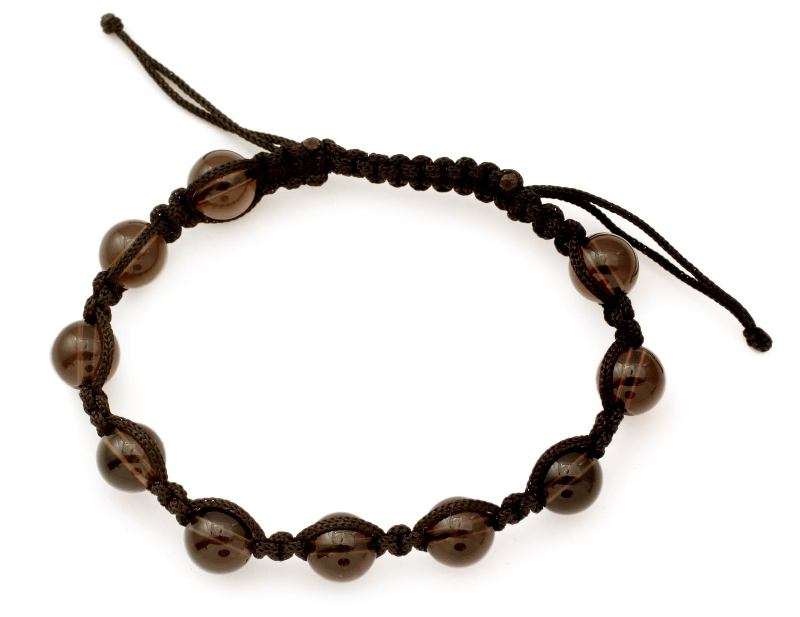 Knotted by hand, this adjustable macramé bracelet from Hema features ten beads of mysterious smoky quartz. This is a Shambhala-style bracelet, representing a mythical kingdom based on ancient prophesies. Shambhala-style represents tranquility, peace and happiness – the oneness of all. Thought to be connected to the universe, smoky quartz surrounds the wearer in an aura of beauty. The bracelet can be adjusted in length by sliding the knot along the cords.