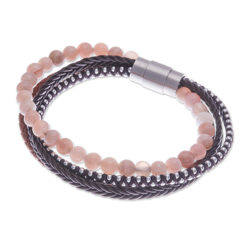 Pale peach beads and rich leather come together on Passaramon's exquisite unisex bracelet. The Thai artisan hand crafts two braided cords from 100% leather, hand threading smooth moonstone beads on a nylon cord before fashioning the last strand from leather and stainless steel beads.