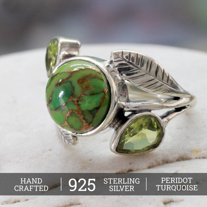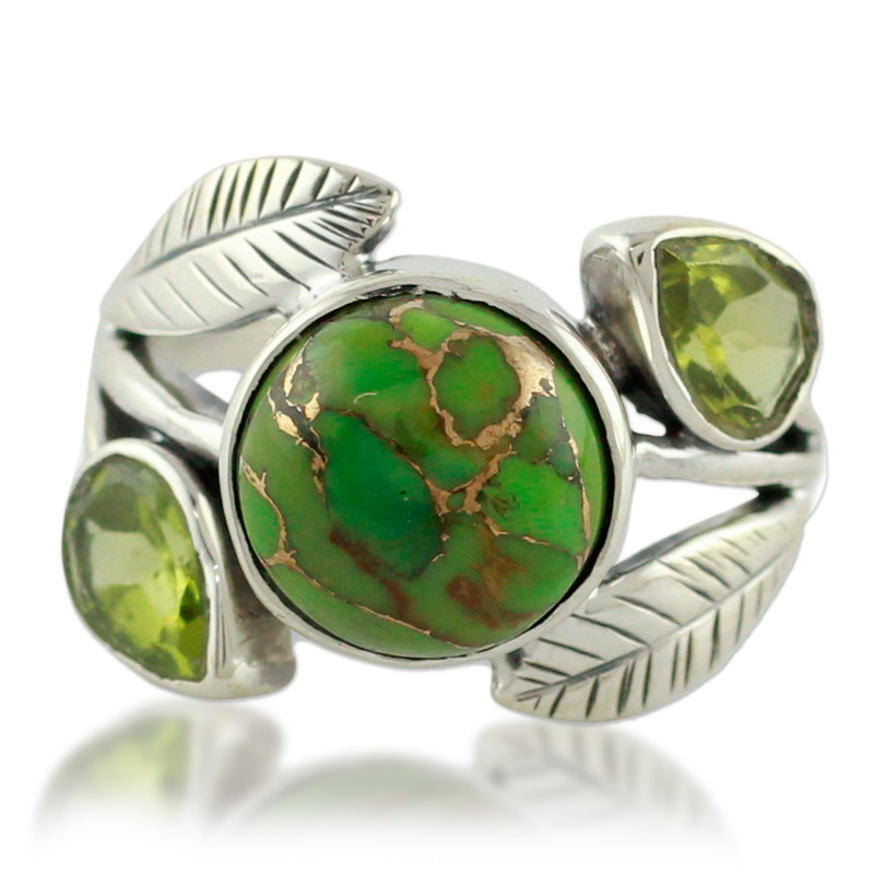 Revealing golden veins, cool green gemstones grace this modern design. Shanker handcrafts a silver ring to showcase composite turquoise and two faceted peridots that total 1.5 carats. Peridot represents August´s birthstone.
