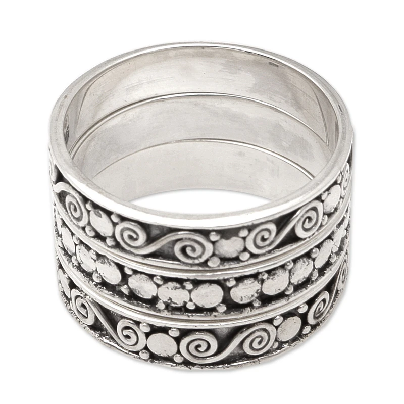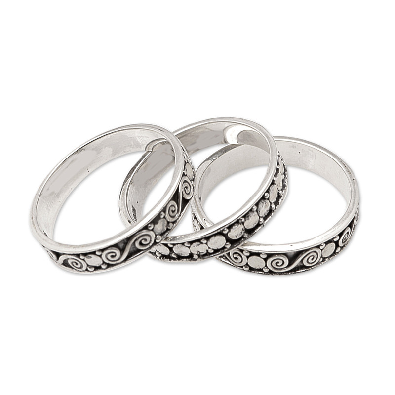 Backed by our 100% Happiness GuaranteeSterling swirls and circles adorn a set of three silver bands. By Buana, these delightful rings can be worn together or separately.