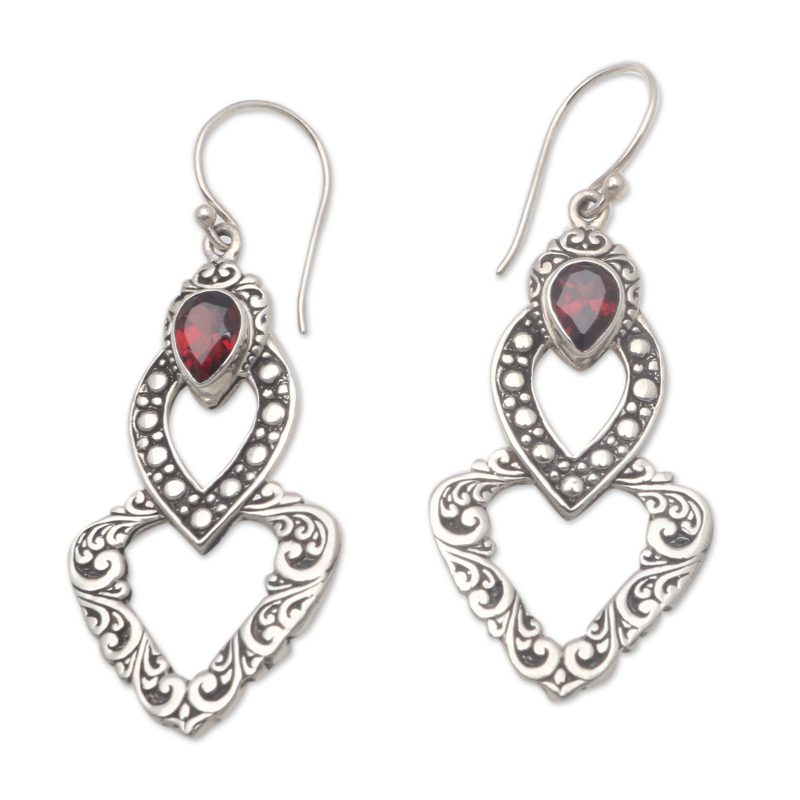 Made from sterling silver wave patterns, two lovely hearts fall below circle-pattern hearts. Balinese artisan Kadek Hendra creates these dangle earrings, accenting each one with a teardrop of faceted natural garnet.