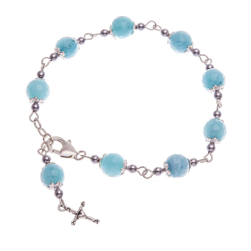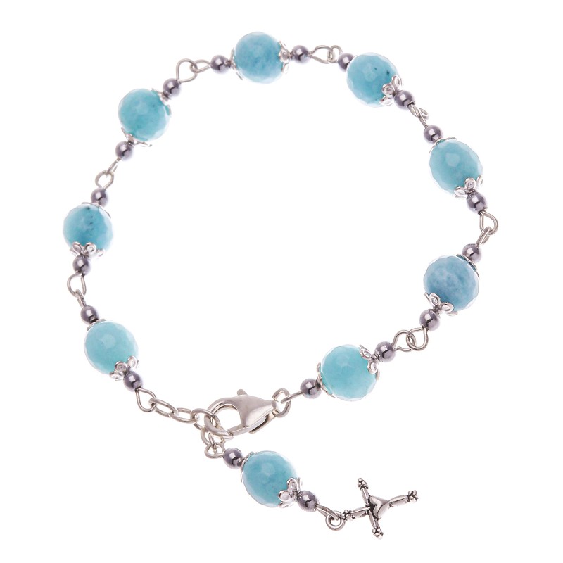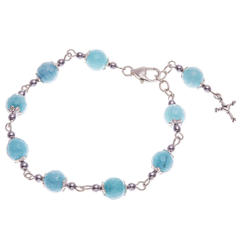 Blue Rosary Hematite and Glass Beaded Rosary Bracelet with Silver Cross