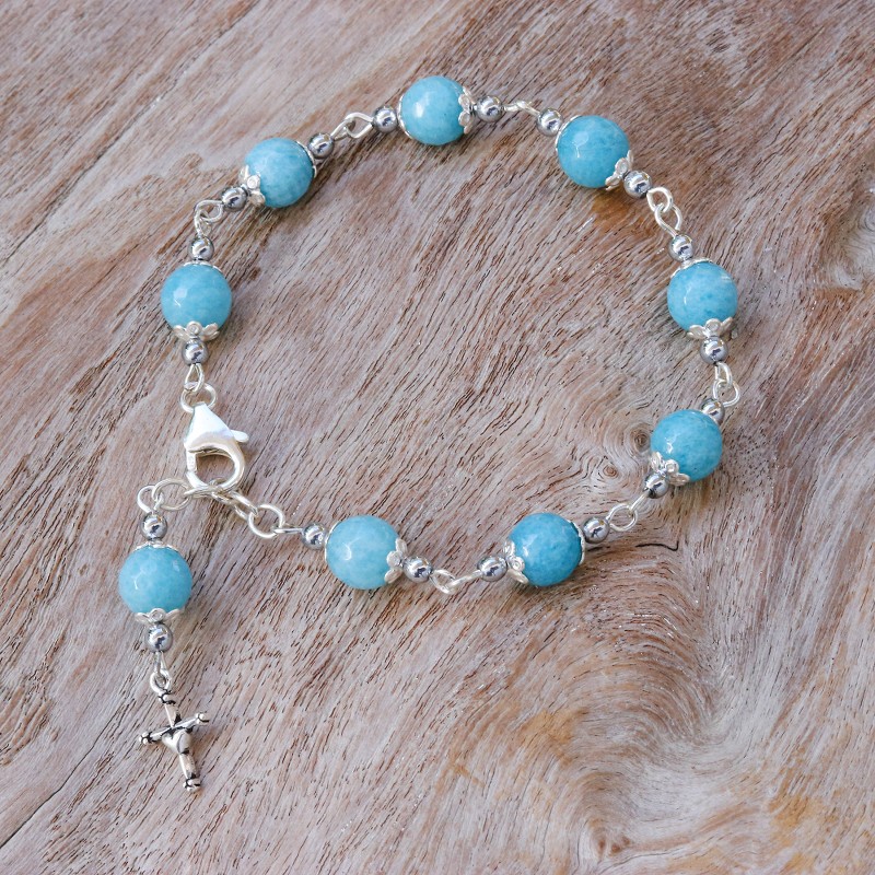 This exquisite rosary station bracelet featuring glass and hematite beads exudes ethereal grace. Meticulously crafted by Thai artisan Tipa, this beautiful accessory is adorned with a sterling silver cross charm that delicately suspends from the extender chain, offering adjustable length. With its lovely polished finish, this bracelet becomes a captivating symbol of devotion and elegance.