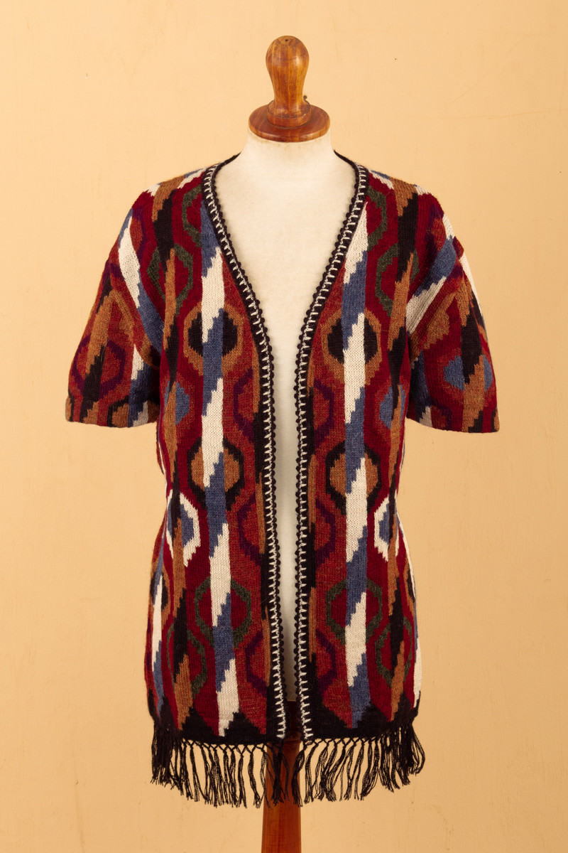 The magnificent Inca Empire left the world a legacy of stunning textiles ornamented with intricate geometric patterns, often in a palette of vibrant hues. As heiress of the ancient Andean culture, Peruvian artisan Maria Cutipa crafts a 100% alpaca cardigan sweater in a kimono style with trendy short sleeves, an open front and elegant fringes dangling from the piece. The garment is also embellished with classic Inca motifs in a warm colour scheme, making this unique design a symbol of the artist's beloved homeland.