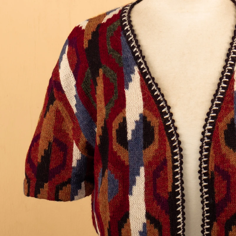 This alpaca cardigan is great for between season wear and is made warmer if you wear a long-sleeved item under it in the dead of winter. I love the fringed bottom and the fabulous colors that work for both warm and cool color types. Beautiful and well done piece. Fits well with my indigenous clothing collection.