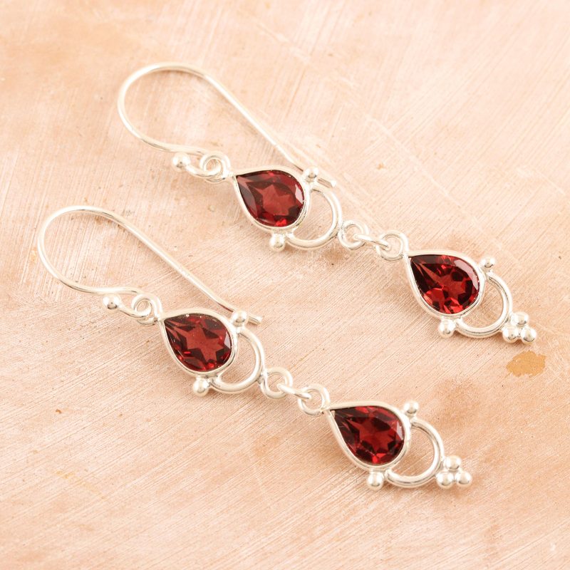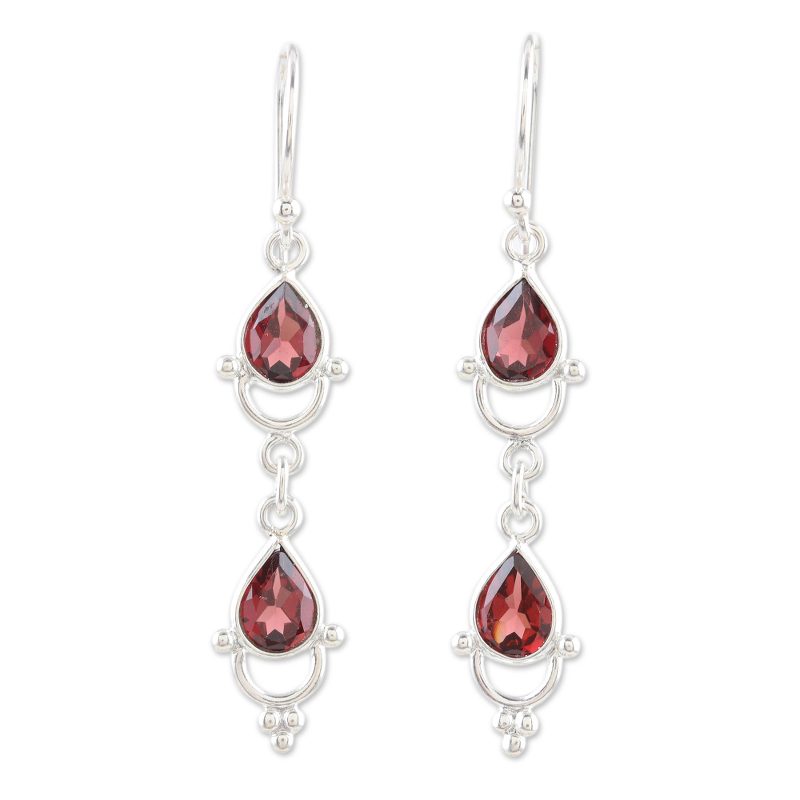Backed by our 100% Happiness GuaranteeWith their deep red gems, vibrant dangle earrings from Bhavesh radiate a calm, healing energy. Two faceted garnet teardrops are linked with decorative sterling silver rings.