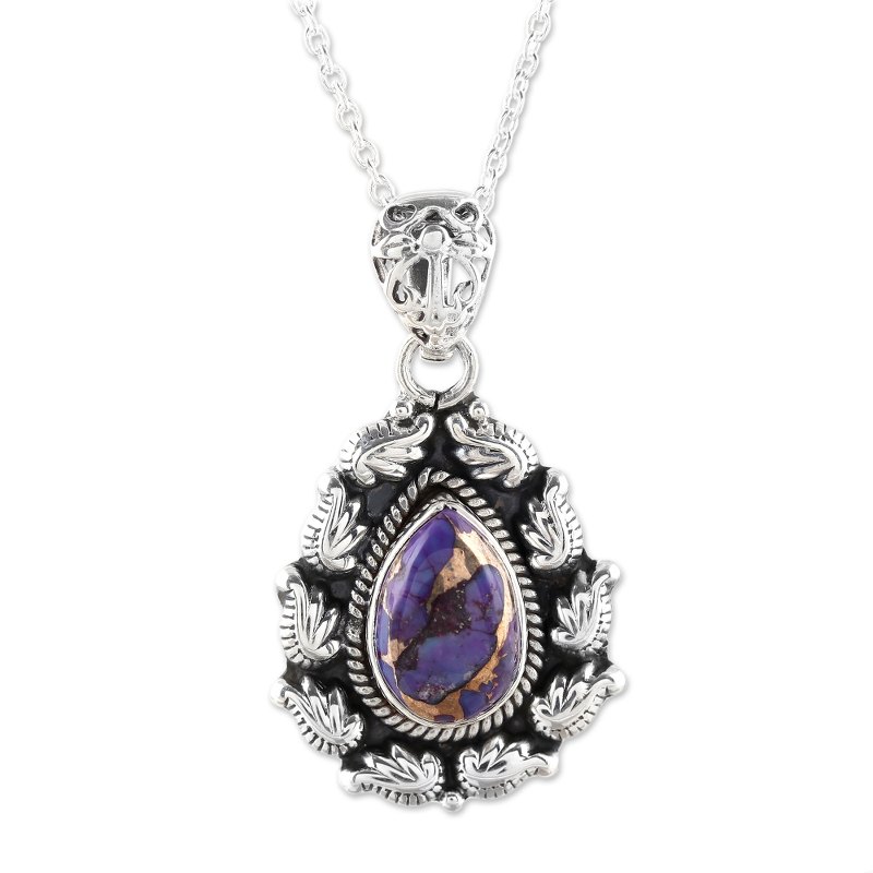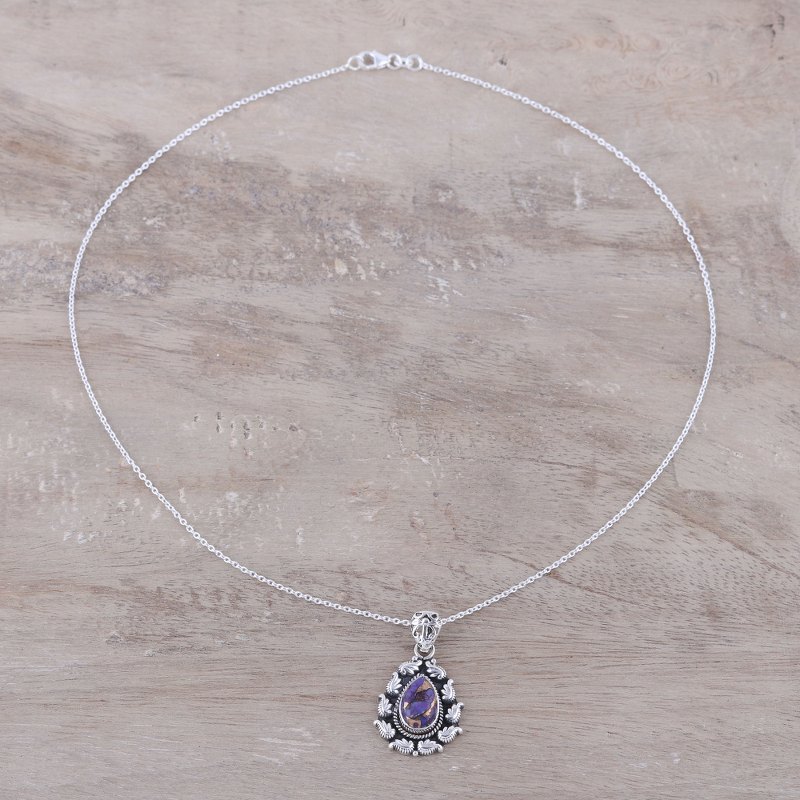 Flame-like petals in sterling silver form a graceful garland around a glowing purple stone in this necklace from Aparna in India. The teardrop-shaped composite turquoise cabochon is set in a rope-style bezel in a pendant with an ornate bale. It centers a sterling silver cable chain.