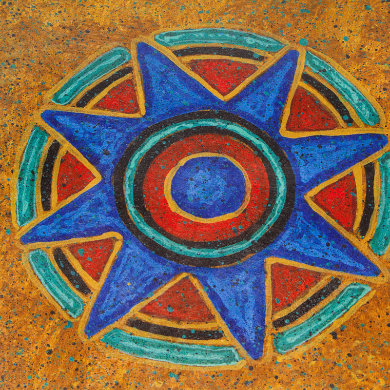 The ancient cultures of the American continent used to create ceramic stamps in a variety of styles that today dazzle many. Inspired by these ancestral artifacts, Rommy from Mexico creates a vibrant giclee print honouring his roots and heritage. The ink, in a palette of blue, green and red hues, forms a round sign that evokes the mystic energy of the sun.