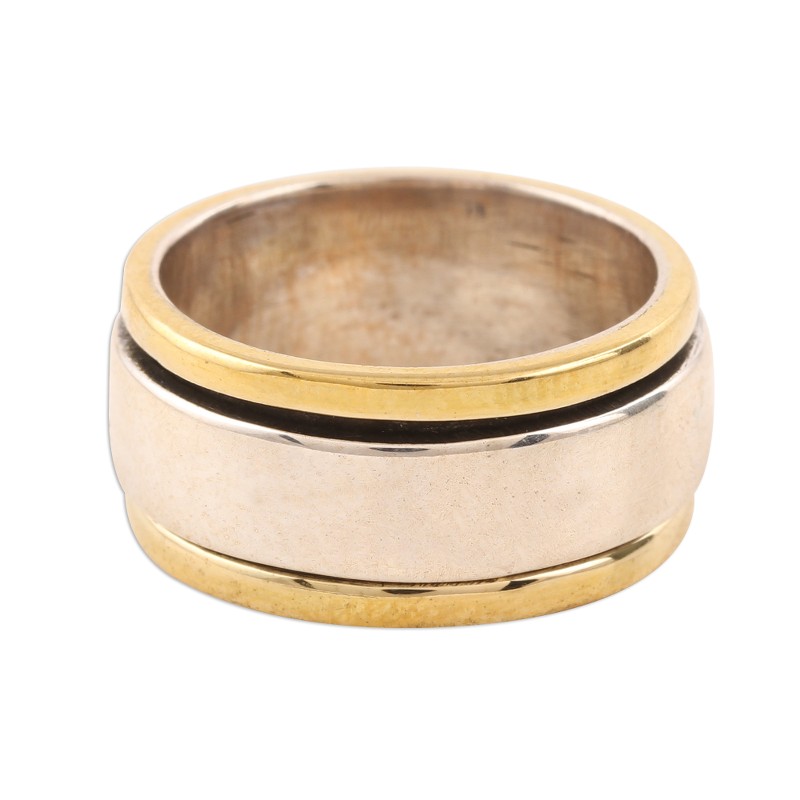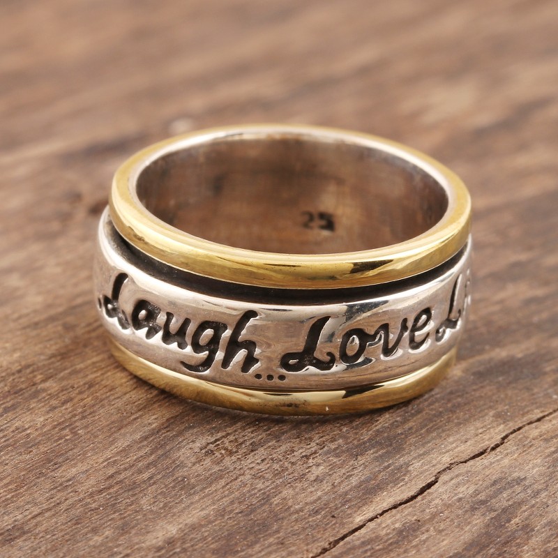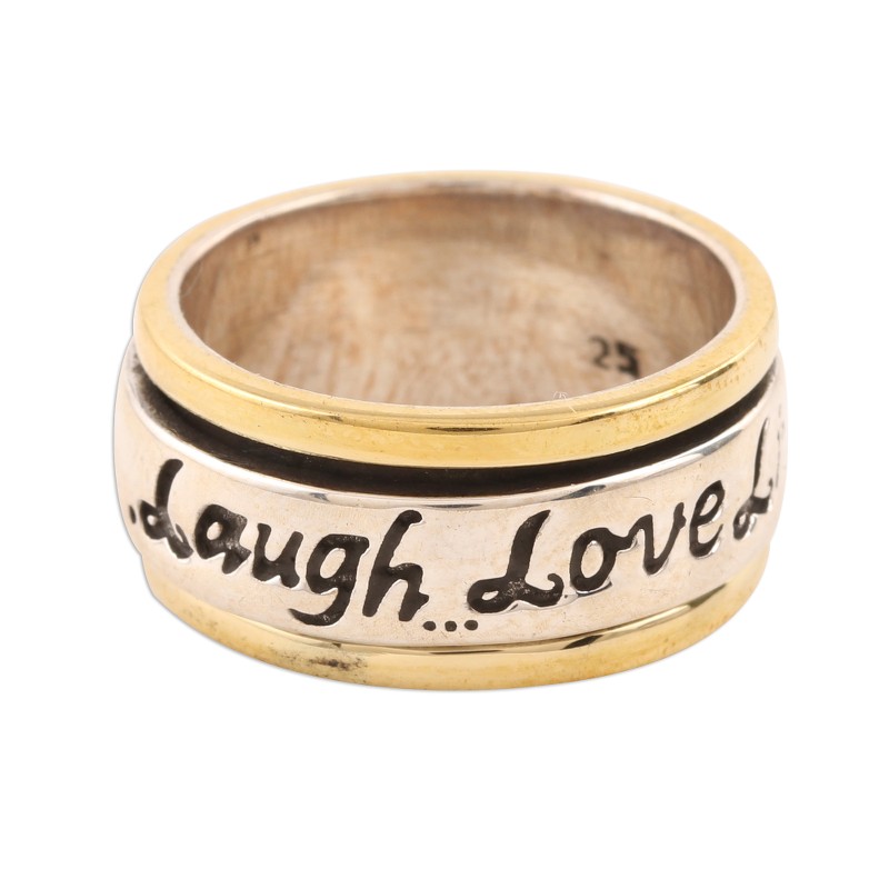 Backed by our 100% Happiness GuaranteeEngraved with the mantra "Laugh Love Live," a band of shiny sterling silver circles this spinner ring from India. Shivani Choudhary designs this inspirational ring, which features a wide sterling band that is accented on the sides with gleaming brass.