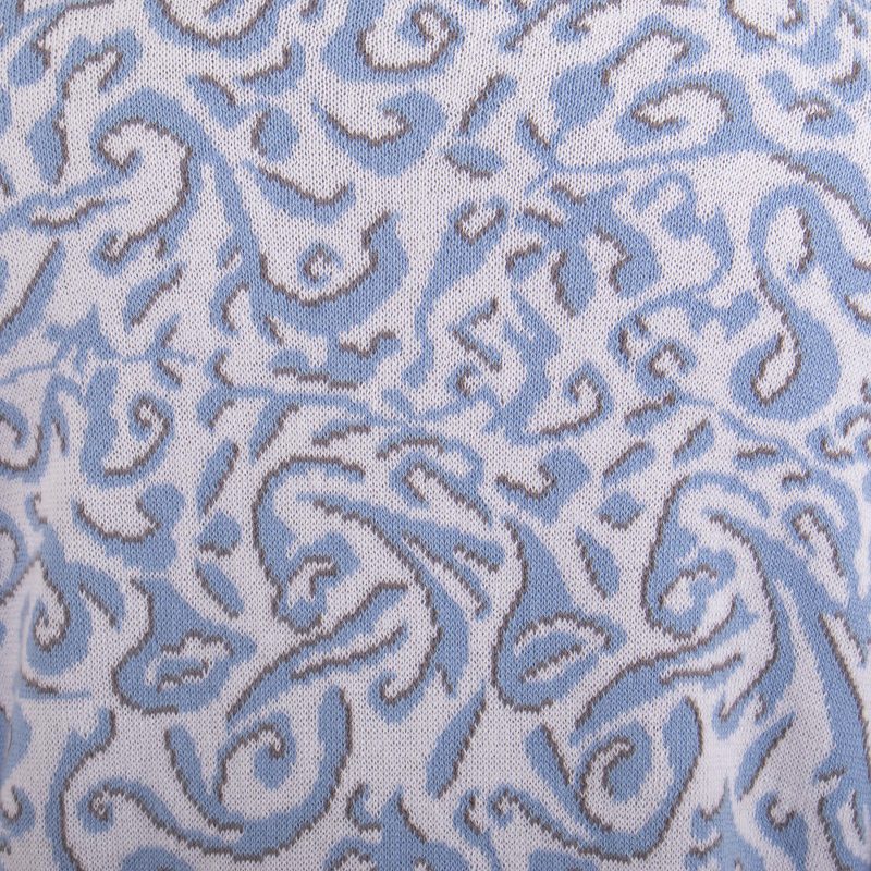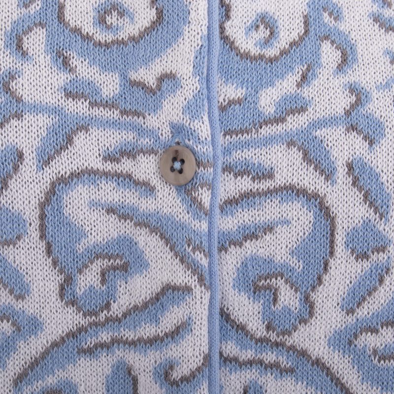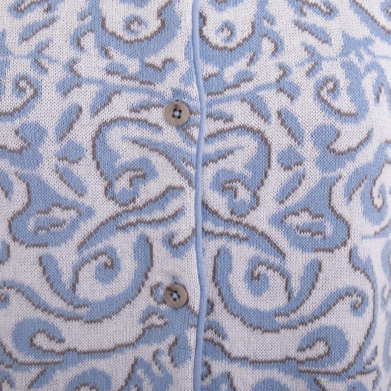 This artsy cardigan is the perfect statement piece. Patricia Lopez knits it from cotton with an abstract jacquard pattern in powder blue, white and grey. Try it out with jeans or paired with a smart skirt.