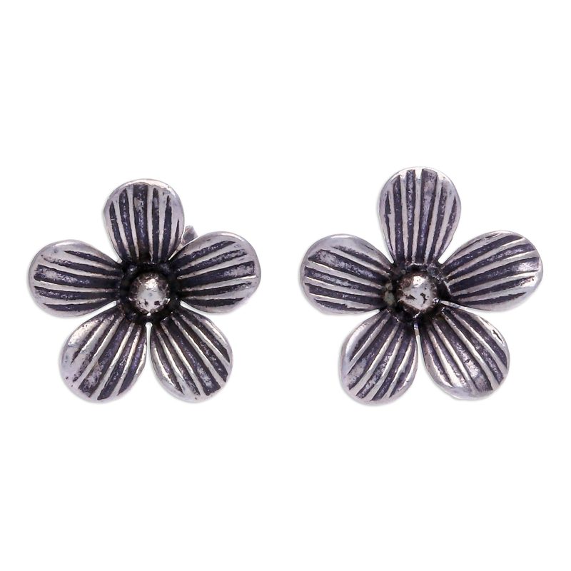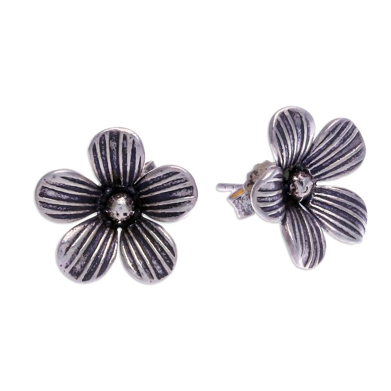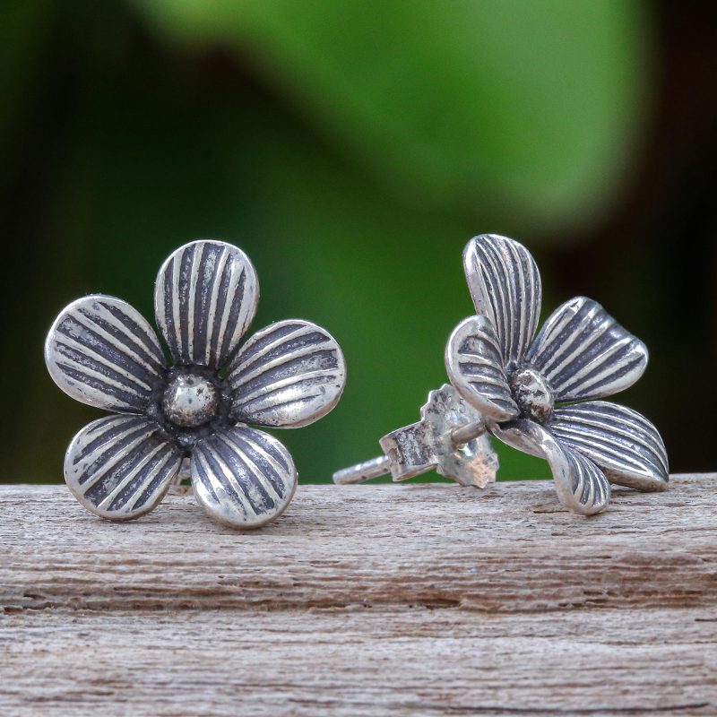 Designed by Sasithon Saisuk, these earrings make the perfect gift for the flower lovers in your life. The Thai artisan crafts five petals from sterling silver, engraving the precious metal with a striped motif enhanced with oxidized details. A sterling silver post clasp finished the pair with shine.