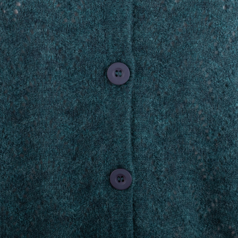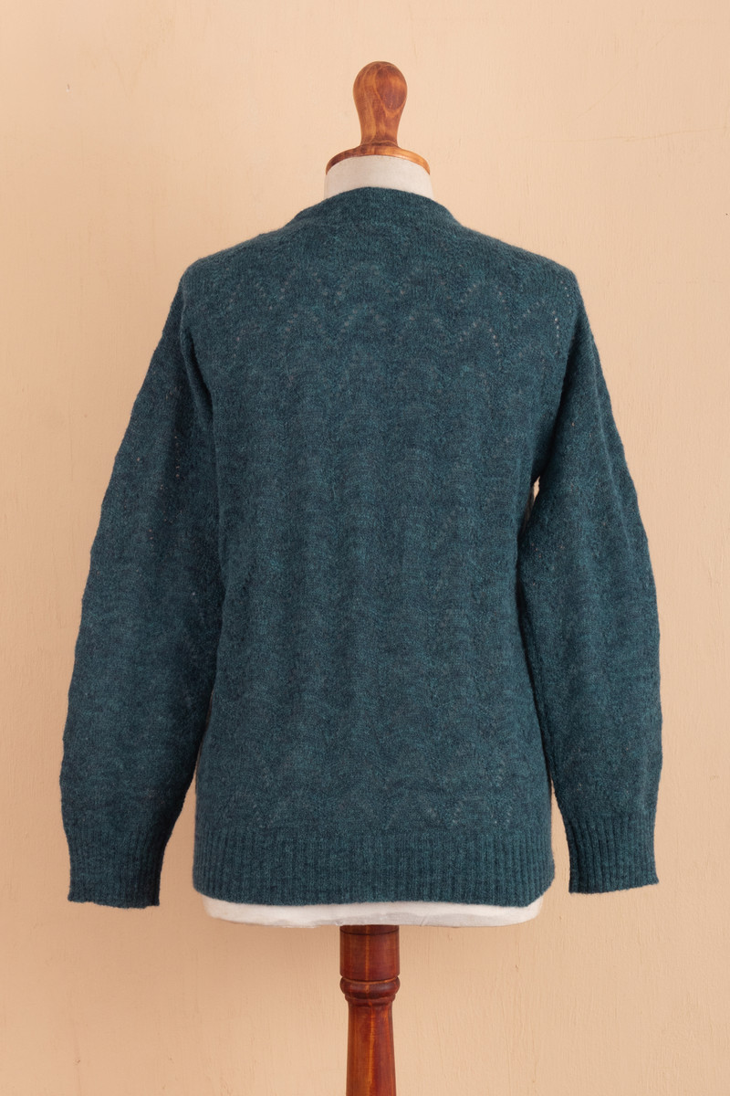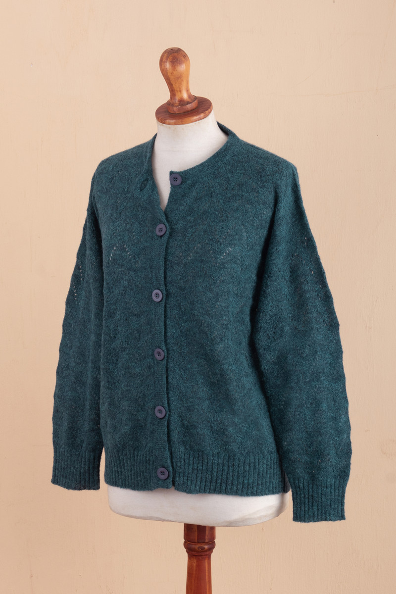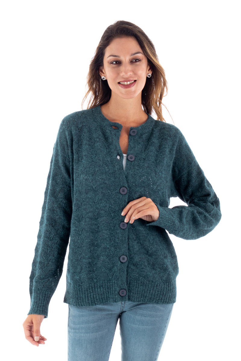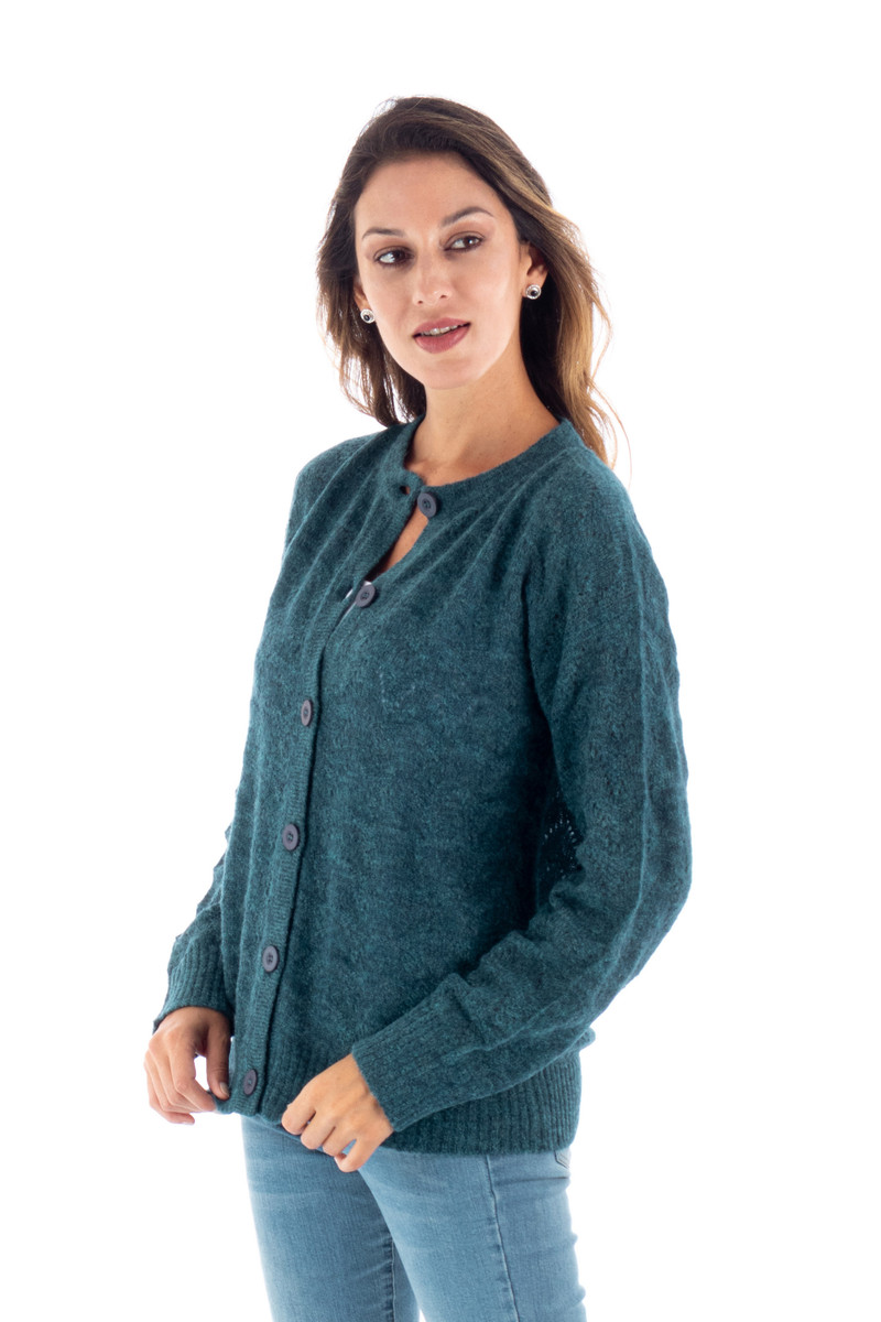 A fabulous azure shade and a soft baby alpaca blend are the key elements of this fashionable knit cardigan that is stylish, comfortable and perfect to wear with your favorite pair of jeans. The long-sleeved cardigan features a button front and ribbed hem and cuffs in a versatile design by Peruvian artisan Wilber Calapuja.