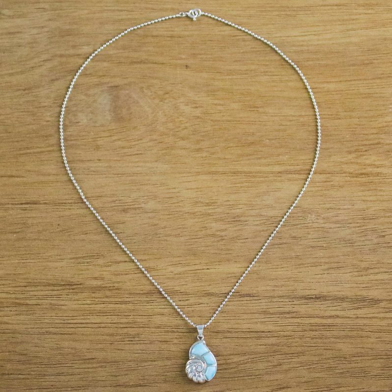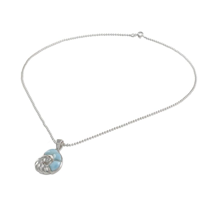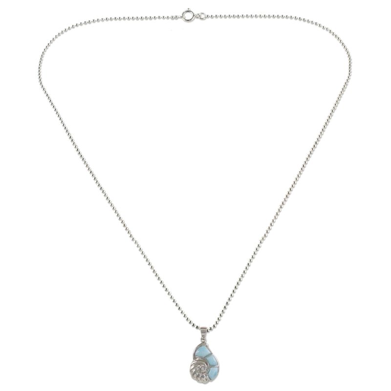 Hear the call of the ocean with this nautilus shell pendant necklace handcrafted by Thai artisan Michael Krainer. Set in sterling silver, the outer three sections of the nautilus are larimar, and a round faceted cubic zirconia gemstone accents the center.