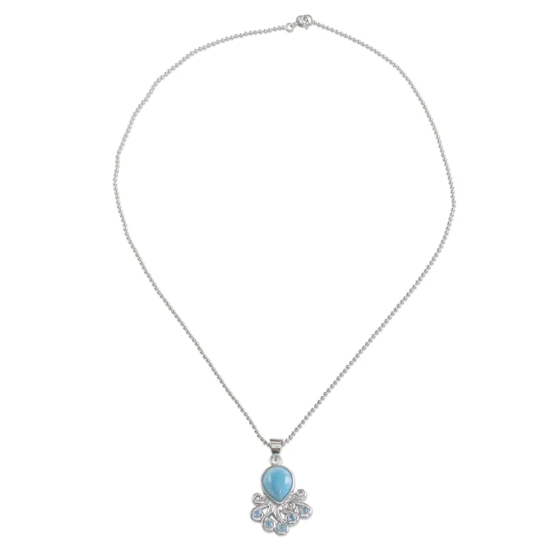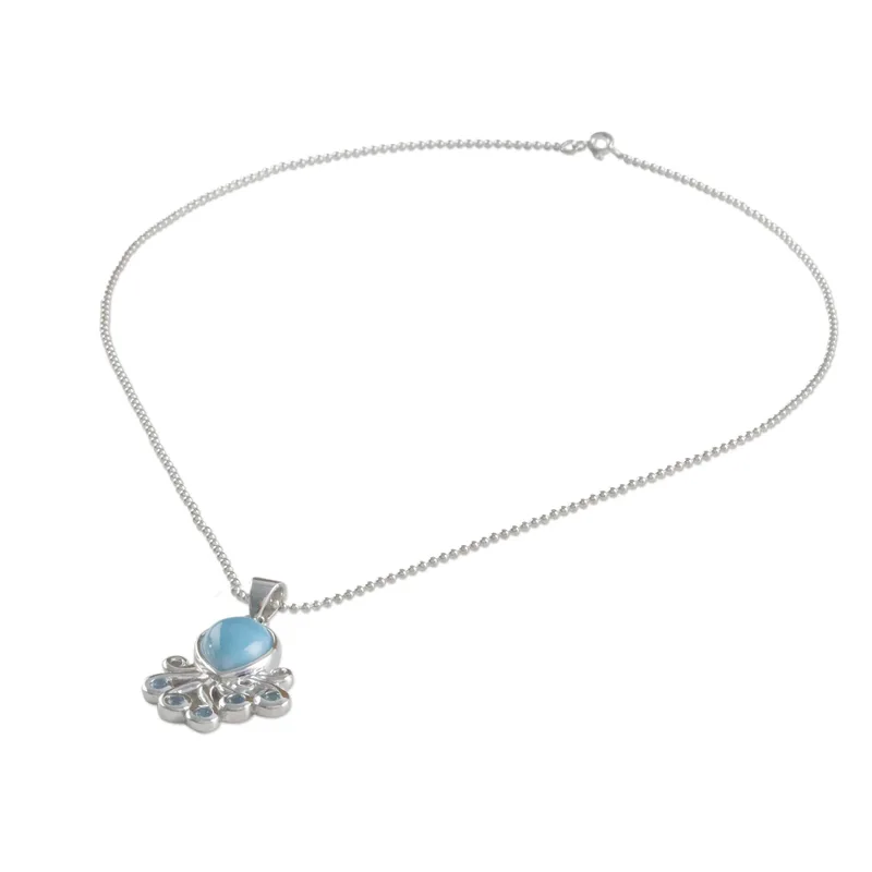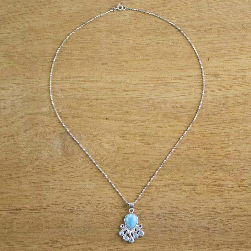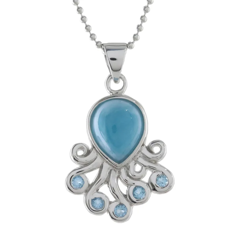 This necklace handcrafted by Thai artisan Michael Krainer features a lovely octopus pendant. Set in sterling silver, the body of the octopus is a teardrop cabochon of smooth larimar, and five of its eight arms cradle a faceted blue topaz gemstone.