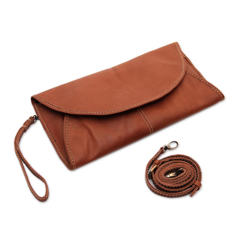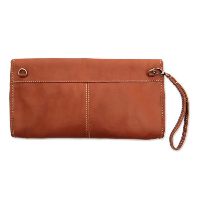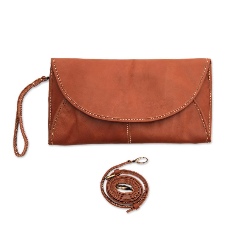 Easygoing and stylish, this handbag from Java is designed by Rella Tung. She works with supple leather in a solid sepia hue to craft this envelope bag by hand. It can be held like a clutch, like a wristlet with a removable wrist strap, or like a sling with a removable, adjustable strap. The front flap opens with a magnetic snap to reveal a faux suede-lined interior, complete with one zipper pocket for organizing your belongings.