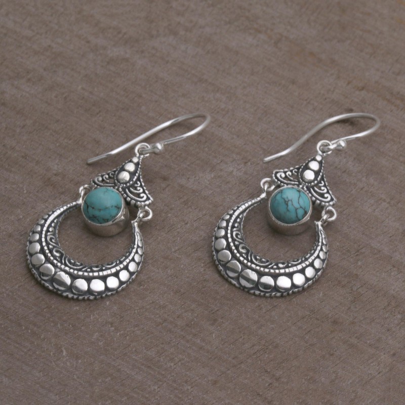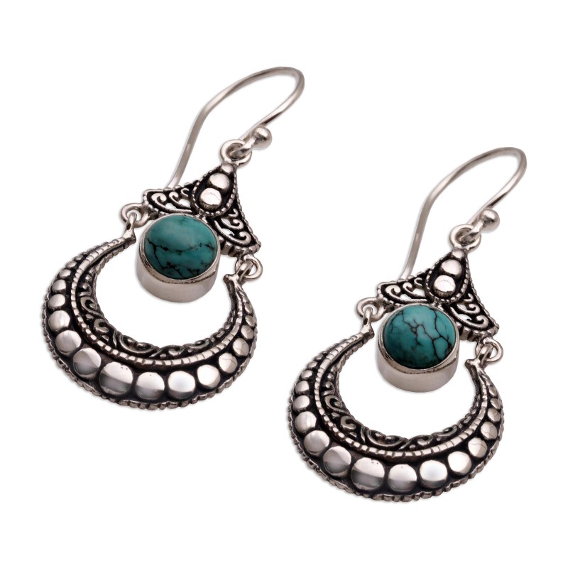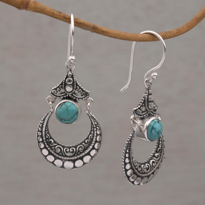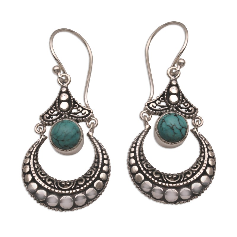 Designed by Balinese artisan Wirabhuwana, these dangle earrings are handcrafted of sterling silver to feature crescent shapes with circle and curl motifs. Each earring cradles a round cabochon of blue-green magnesite.