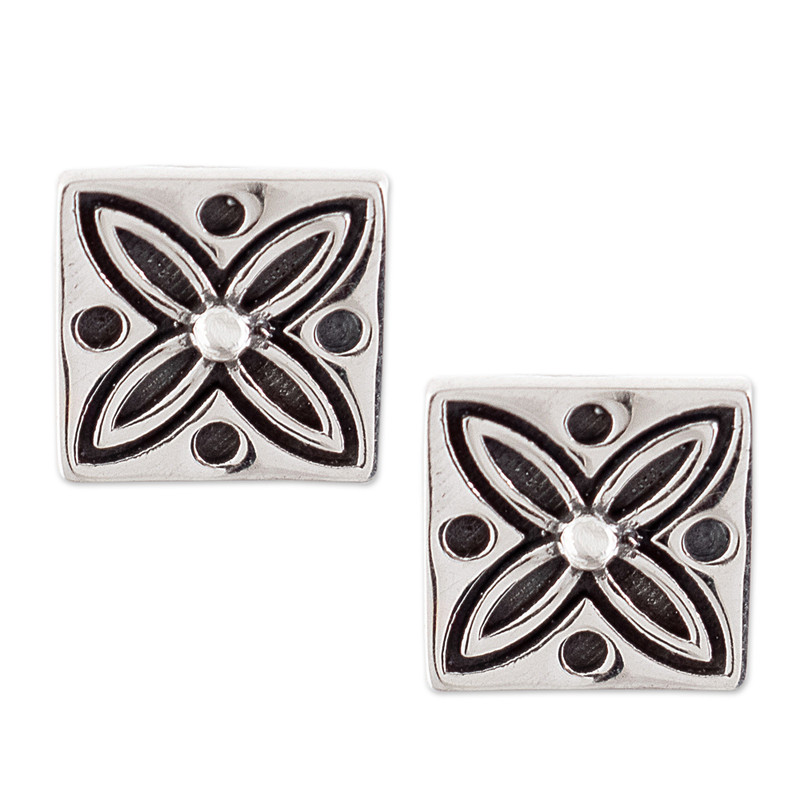 Surrender to the historical elegance of these exquisite sterling silver stud earrings inspired by the intricate patterns of the Majolica tiles that adorned the floors of churches and mansions during the time of the Viceroyalty of Peru. Designed by Jorge Perez, the earrings are crafted through hammering, piercing and soldering techniques, showcasing a captivating floral motif and a harmonious interplay of oxidized and polished finishes.