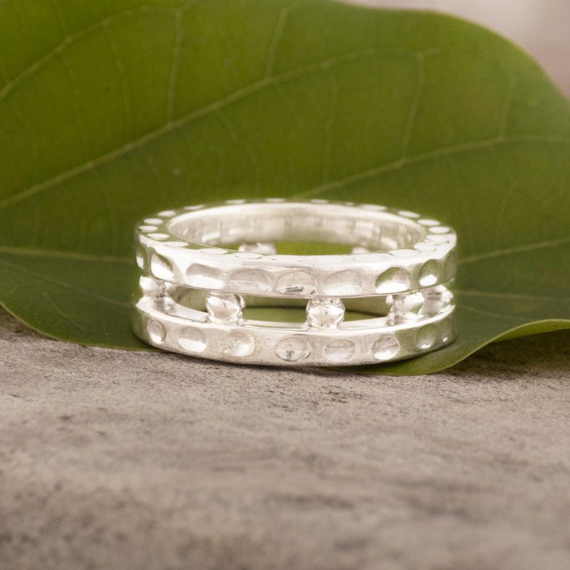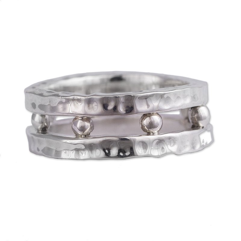 Possessing the masculine energy of Thor, this men's band ring is designed by Peru's Rosa Tomatis. She works with local artisans, who craft the gleaming double bands of hammered sterling silver, accentuated with round baubles in the middle.