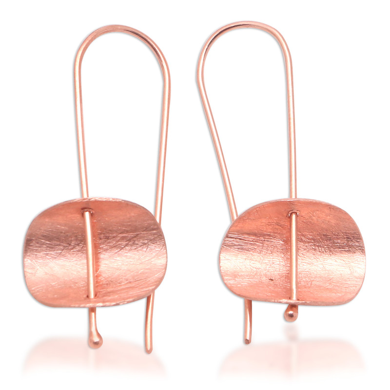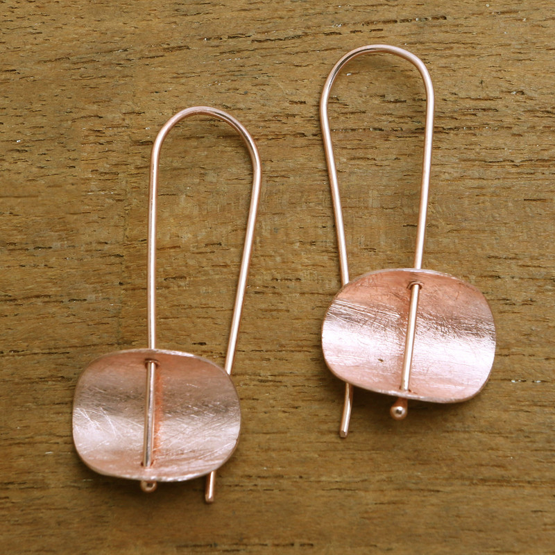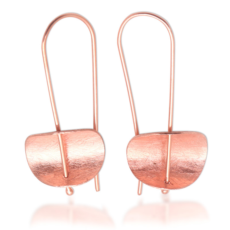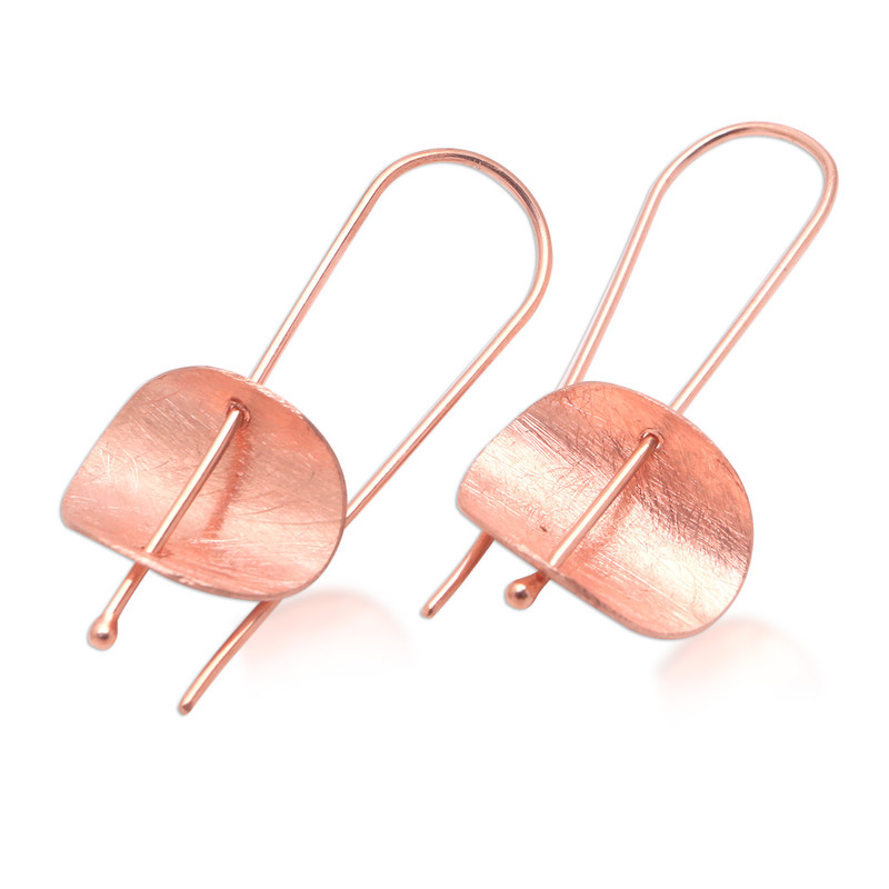 The modern, minimalist design of these earrings is by Desi Antari in Bali. She crafts the 18k rose gold plated sterling silver earrings by hand and finishes them with brushed satin textures.