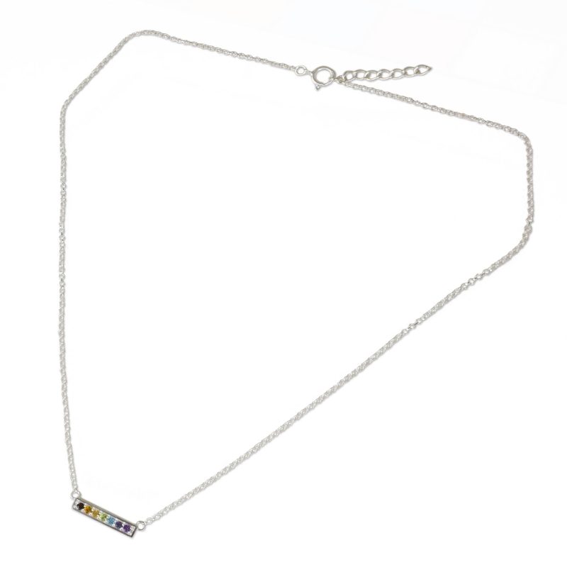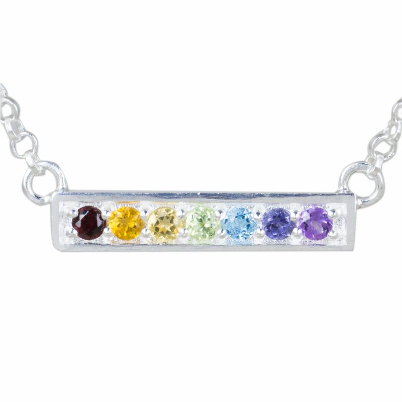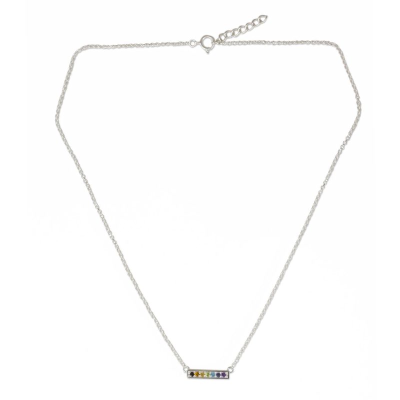 Sarote Lochotinunt in Thailand creates a pendant necklace with a rainbow of gems to represent the seven main chakras or energy channels within the body. The sterling silver bar pendant is set with round faceted amethyst, blue topaz, citrine, garnet, iolite and peridot. The sparkling pendant centers a sterling silver rolo chain.