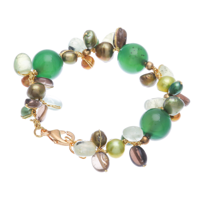 The magical sensations of spring are captured in an exquisite design by Nareerat. Made using golden threads and 18k gold-plated brass accents, this beaded bracelet has a gorgeous palette in green hues, evoking nature's majesty. Each element is arranged meticulously by the artisan, who follows traditional Thai techniques that make the green quartz, smoky quartz, prehnite, cultured pearls and brass beads shine.
