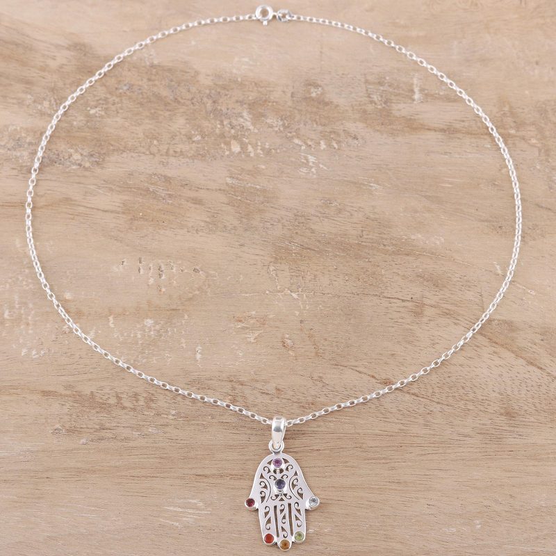 Backed by our 100% Happiness GuaranteeRepresenting the seven chakras, petite faceted gemstones of amethyst, iolite, garnet, blue topaz, carnelian, citrine, and peridot decorate the pendant of this necklace from India. Alok Jain presents this accessory, featuring a sterling silver hamsa pendant that houses the gemstones. Believed to bring protection, hamsa is a cultural symbol that takes the shape of a hand.