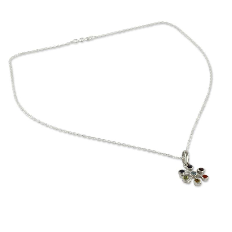 Glistening gemstones align with chakra energies on the basis of their color, inspiring this pinwheel pendant necklace from Alok Jain. In Sanskrit, chakra refers to an energy vortex through which vital universal forces are channeled, and there are believed to be seven in the human body. When all seven are aligned the person feels a healthy sense of well being. In this sterling silver necklace includes amethyst, iolite, citrine, peridot, garnet, blue topaz, and carnelian. The clear and light purple stones are associated with the 7th chakra (awareness and wisdom); the purple, violet and indigo gems with 6th chakra (insight and perception), and the blue or light blue with the 5th, that of communication and truth. Green and pink stones are for love and compassion, linked to the heart, on the 4th chakra. For inner power and will, the 3rd chakra is associated with yellow gems, whereas emotion and sexuality are linked to red and orange gems for the 2nd chakra. Black gems are used to stimulate the 1st chakra, that of stability and security.