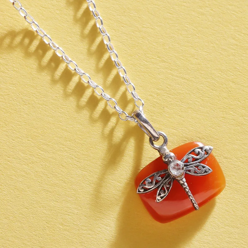 Backed by our 100% Happiness GuaranteeA dragonfly flutters towards a necklace, announcing an era of courage. India's Bhavya Jain crafts this sterling silver piece with classic silversmithing techniques that add an exquisite touch to each detail. The dragonfly softly caresses a carnelian cabochon, whereas a white quartz crowns the pendant.