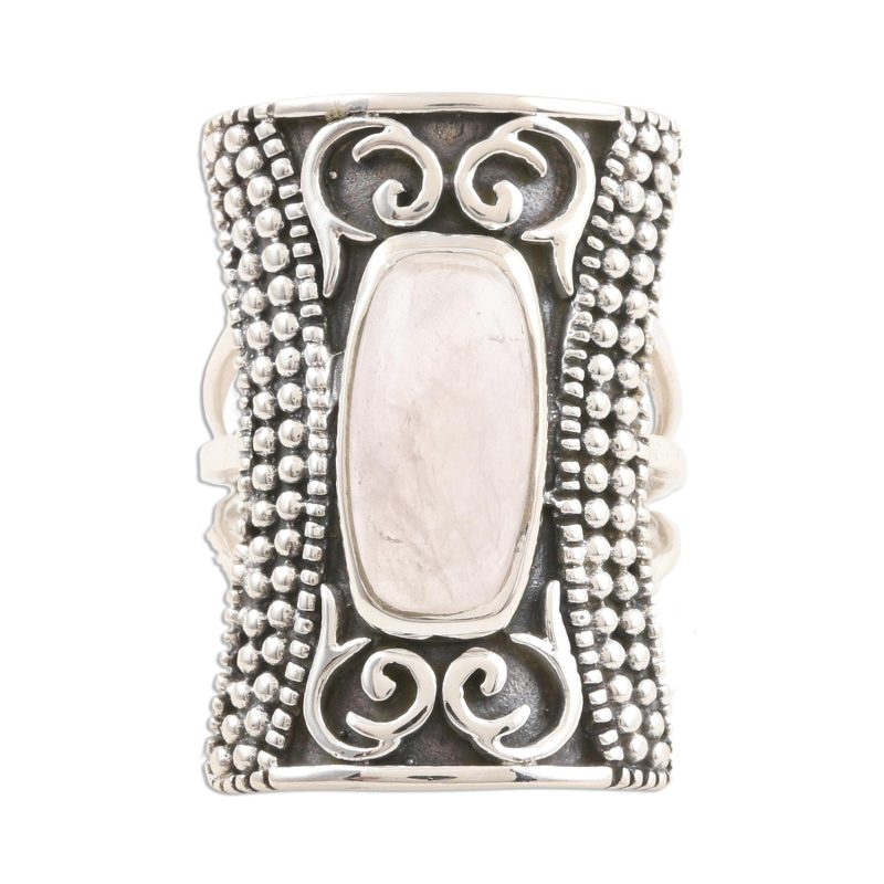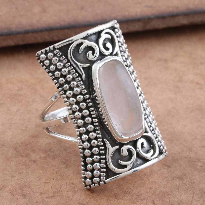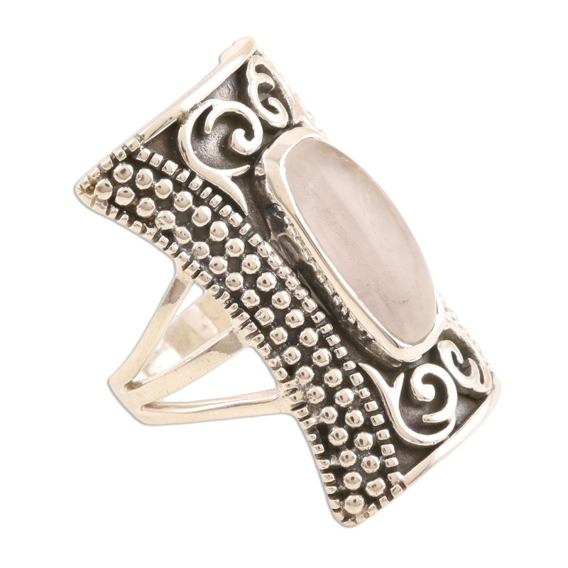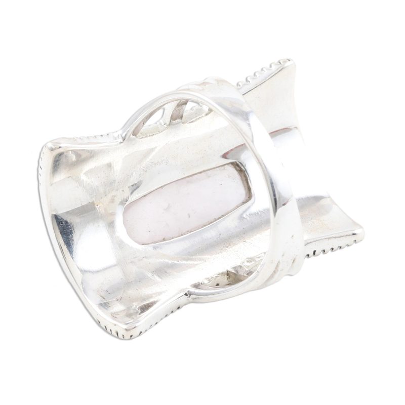India's Chintan presents this stunning cocktail ring, which features an unusual oblong gemstone. A rose quartz cabochon is bezel set in sterling silver, augmented by a delicately curved rectangular frame with intricate swirls and dots. The ring is oxidized for contrast and definition.