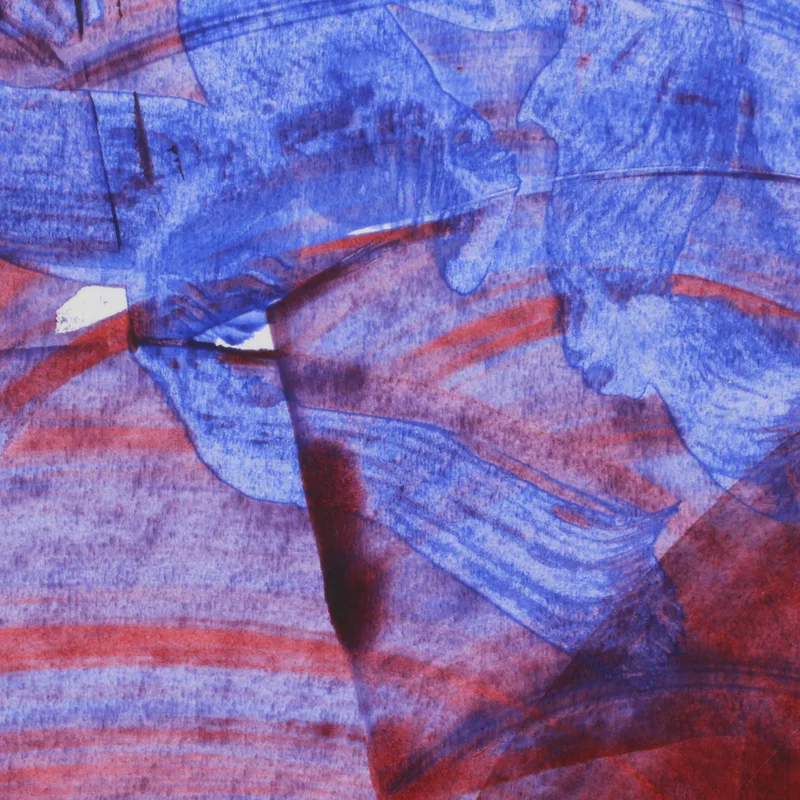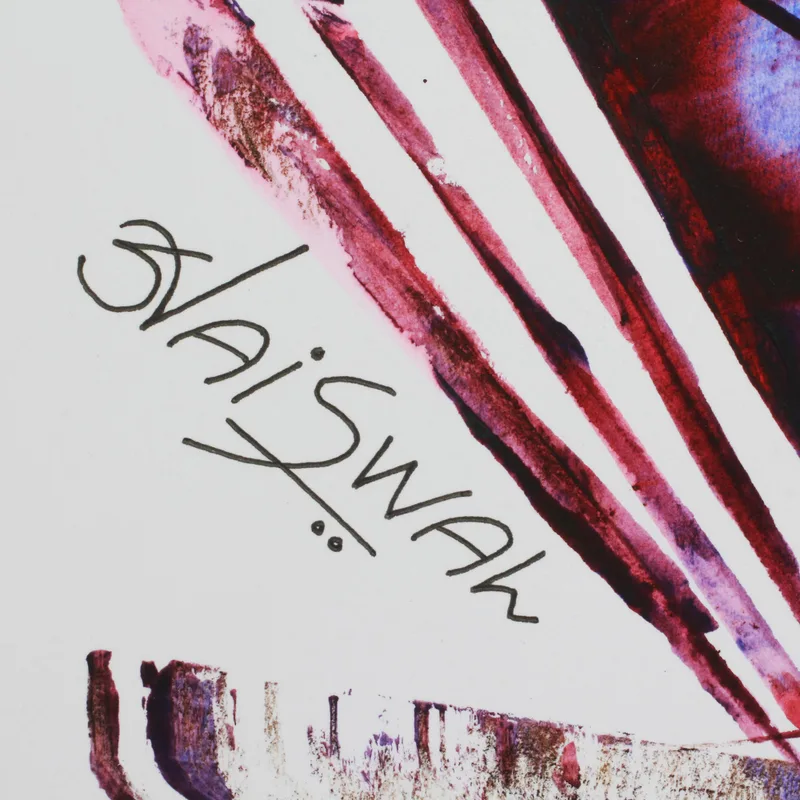 This unique painting features beautiful shades of red, purple, and blue that depict the faces of people and sea life, blending together in one vibrant, harmonious being. Indian artist Sunil Jaiswal celebrates the union between people and nature in this colorful composition, capturing their forms to suggest their unity. This painting is the third in a series of three.