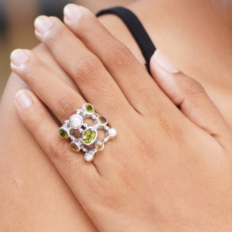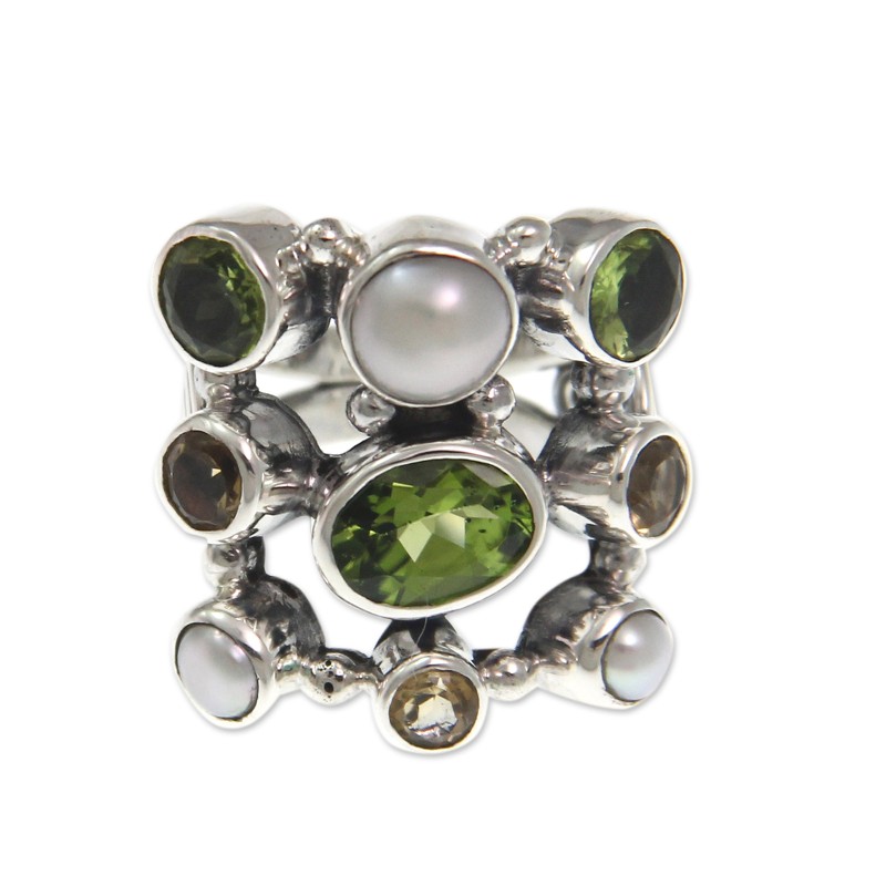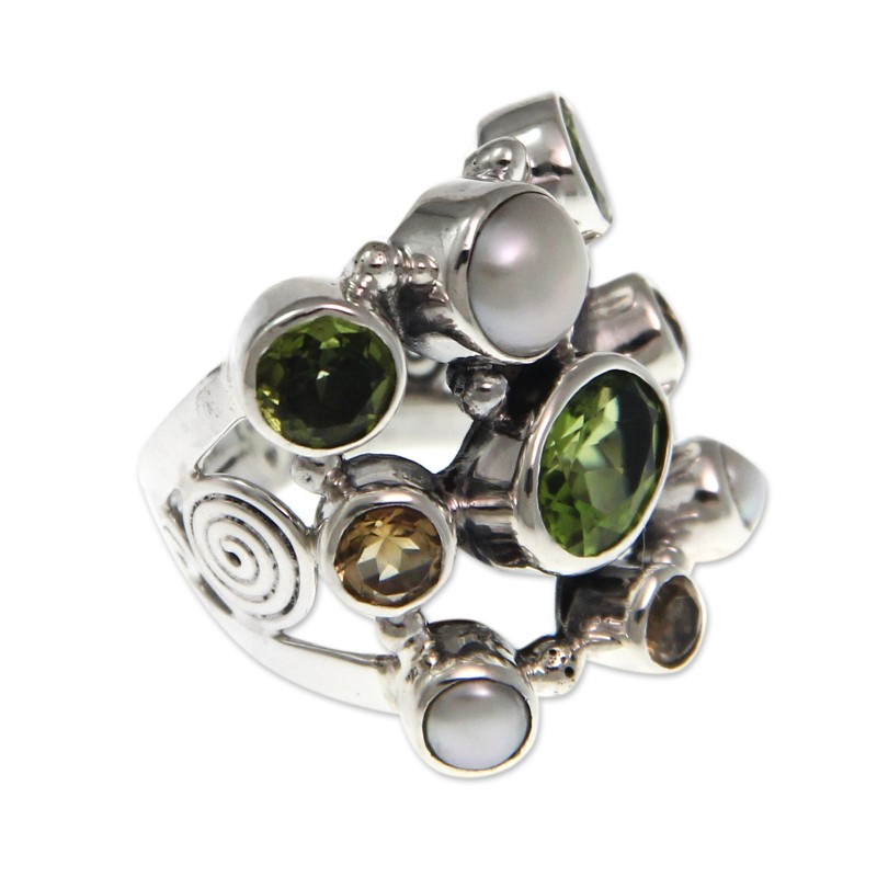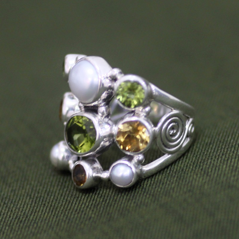 Ornate and beautiful, this sumptuous design is the work of Buana. He crafts a wide band with silver spirals on each side. In the center, white pearls are flanked by sparkling citrine and cool peridot that total 2.2 carats.