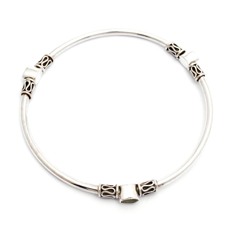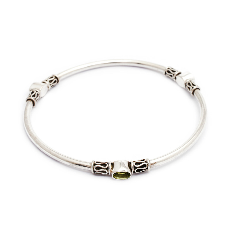 Backed by our 100% Happiness GuaranteeHarmoniously simple, this bangle bracelet from Bali artisan Komang Suastra features a slender silver tube punctuated by vibrant green peridot. The three gemstones, which total 1.5 carats, are flanked by Balinese-style silverwork with a contrasting oxidized finish.