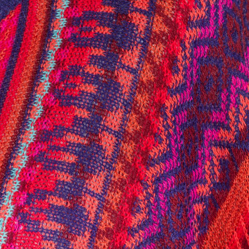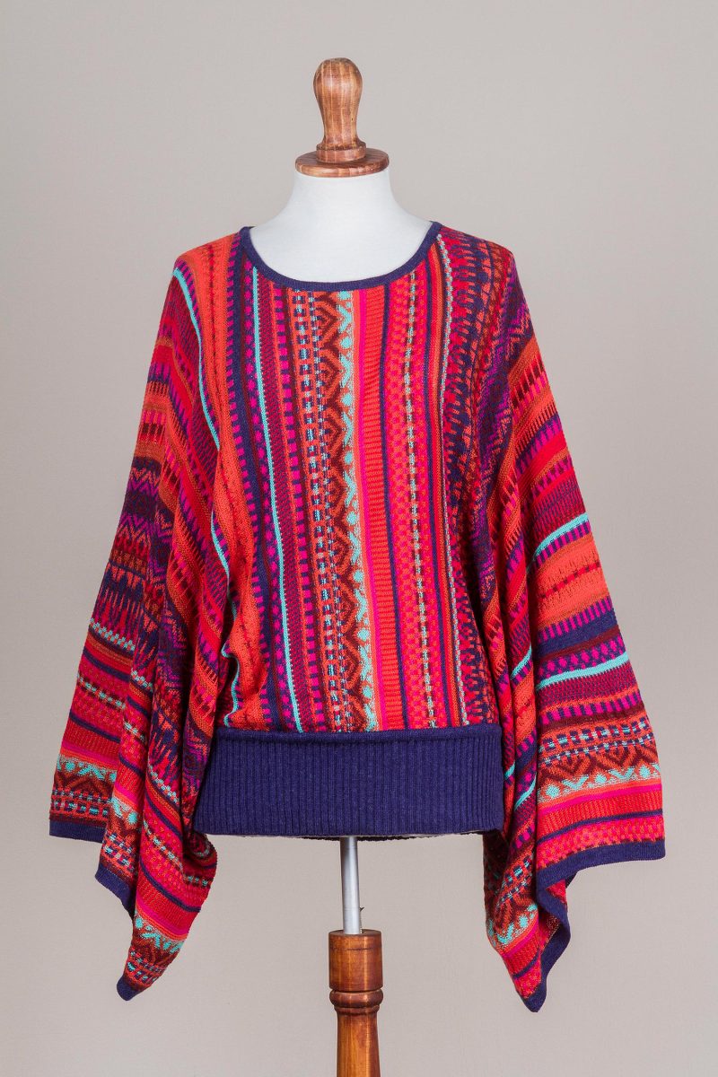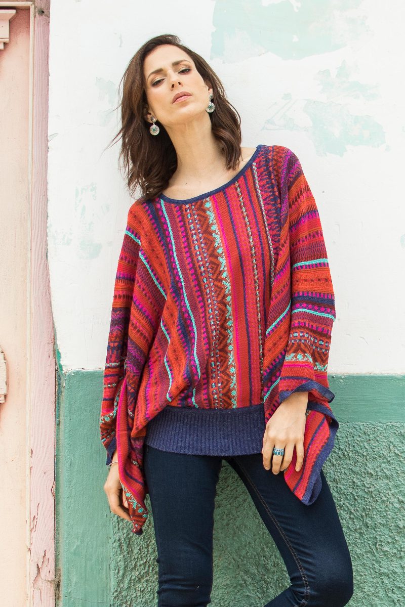 Wear your heart on your sleeve in this brightly knit sweater from Peruvian designer Alfredo Falcon. Underscored by maroon, vermilion, and deep pink, this piece features bold, multicolor stripes, a fitted waistline, and wide sleeves. Indigo collar, cuffs, and waistband are the finishing details that make this fun and fashionable sweater.