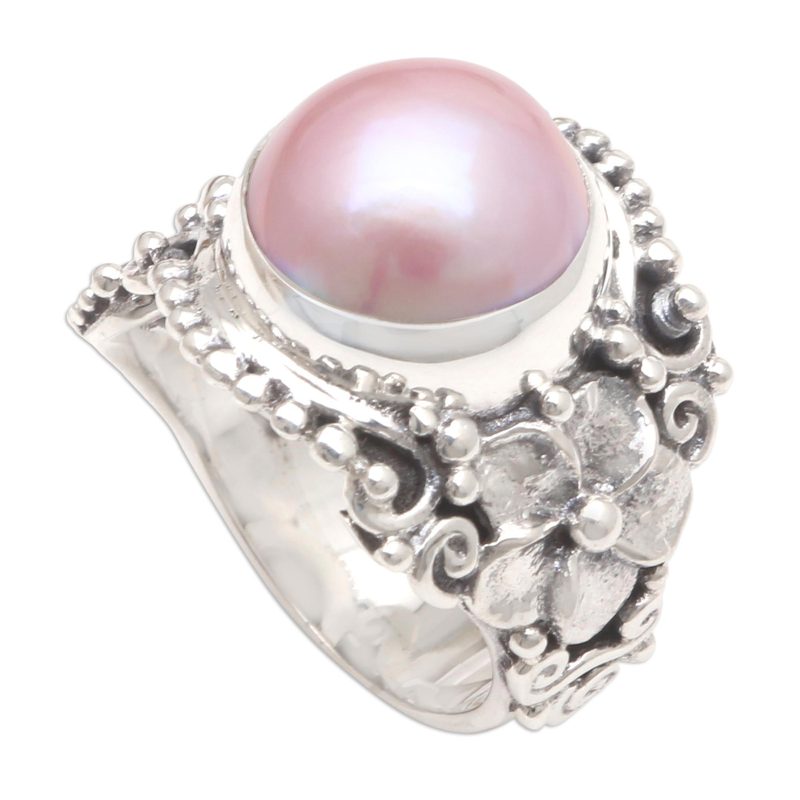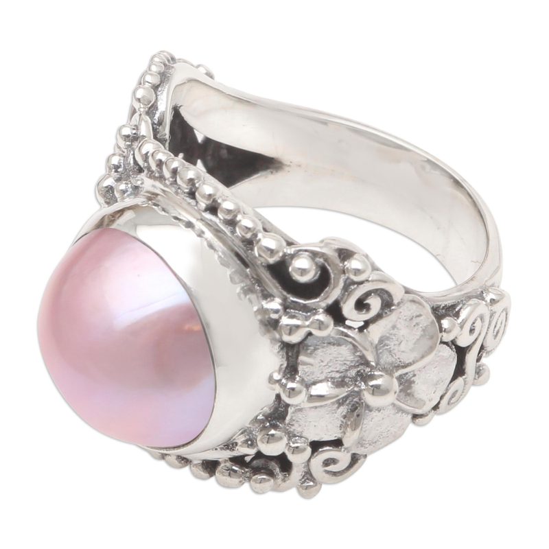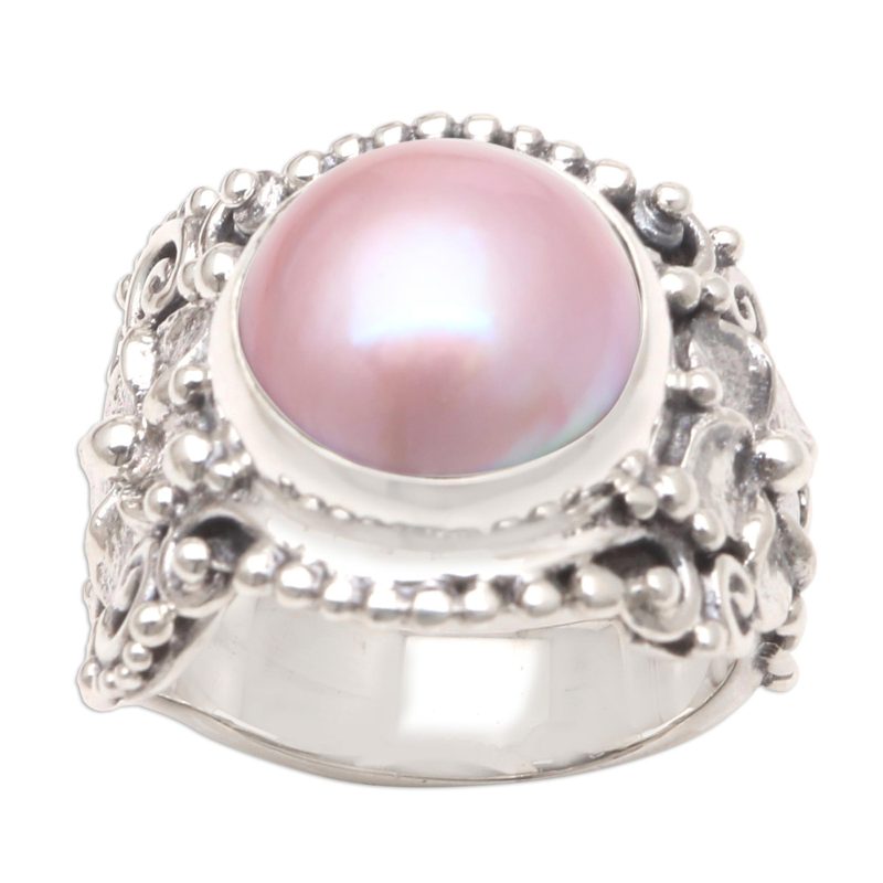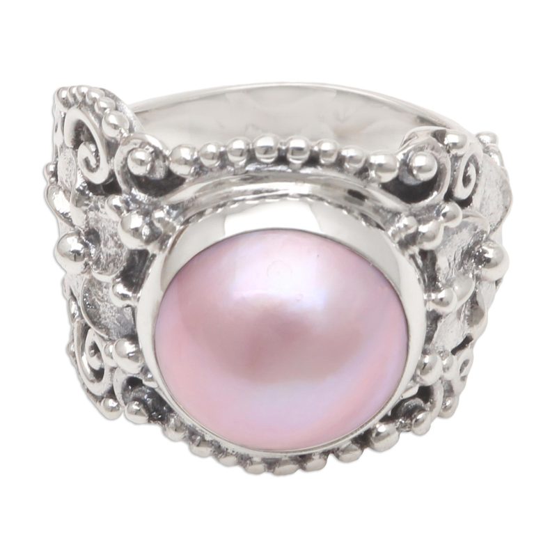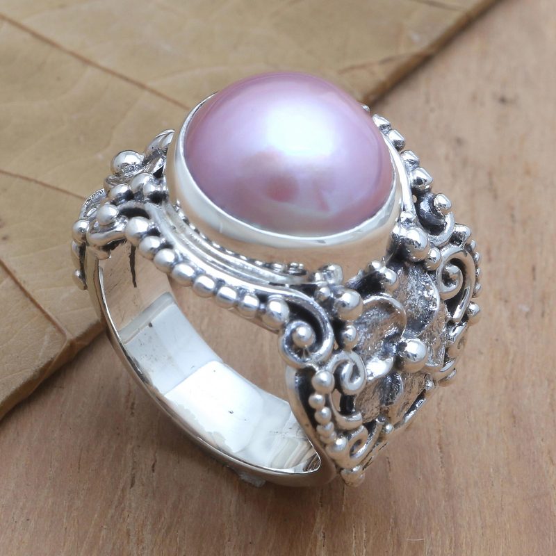 Accented by a large pink pearl, Buana's stunning cocktail ring is sure to become your favorite piece of jewellery for romantic occasions. The Balinese artisan uses sterling silver to hand craft the ring, engraving the precious metal with traditional Balinese swirls. centreed by a cultured Mabe pearl, the ring glows softly.