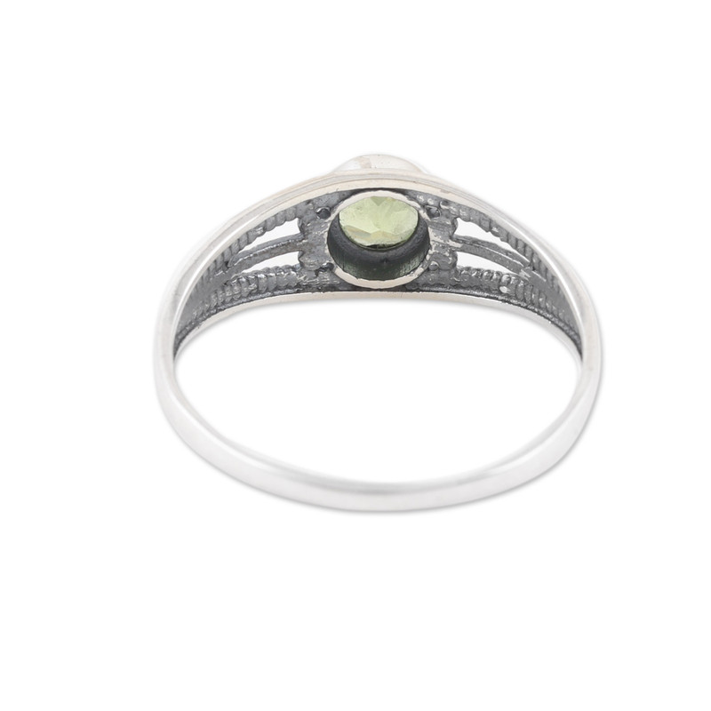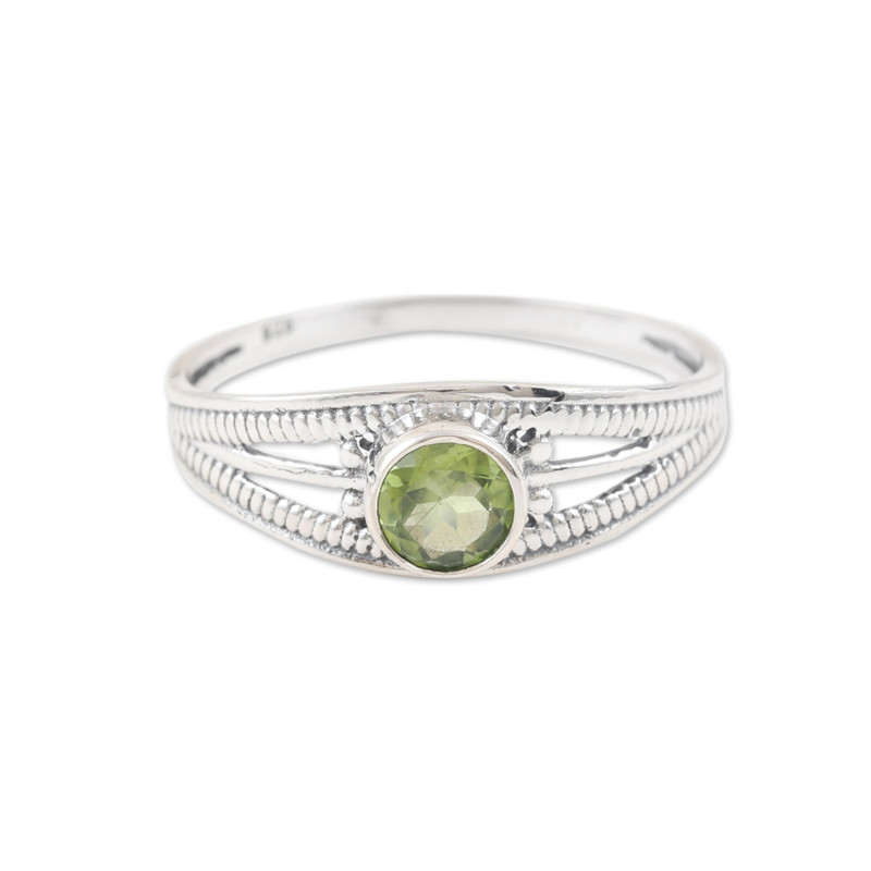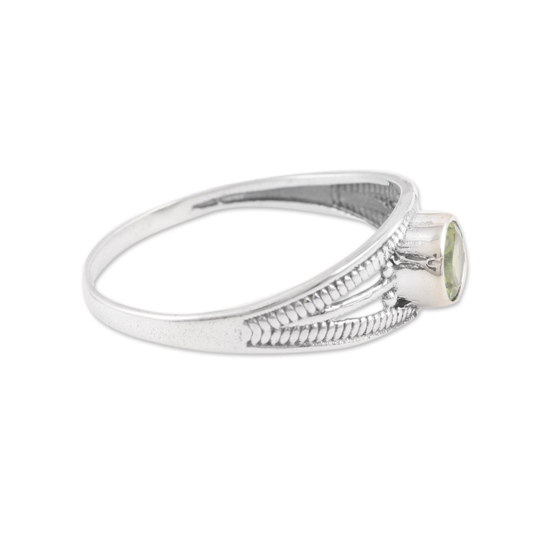 Bhavya Jain shows the world her expertise with a stunning collection inspired by classic trends and precious jewels. Working with sterling silver, the Indian artisan creates this domed ring featuring braided motifs and little beads at the centre, enhancing the beauty of a natural peridot stone. With a faceted style for a charming look, the jewel is also associated with good luck and fortune.