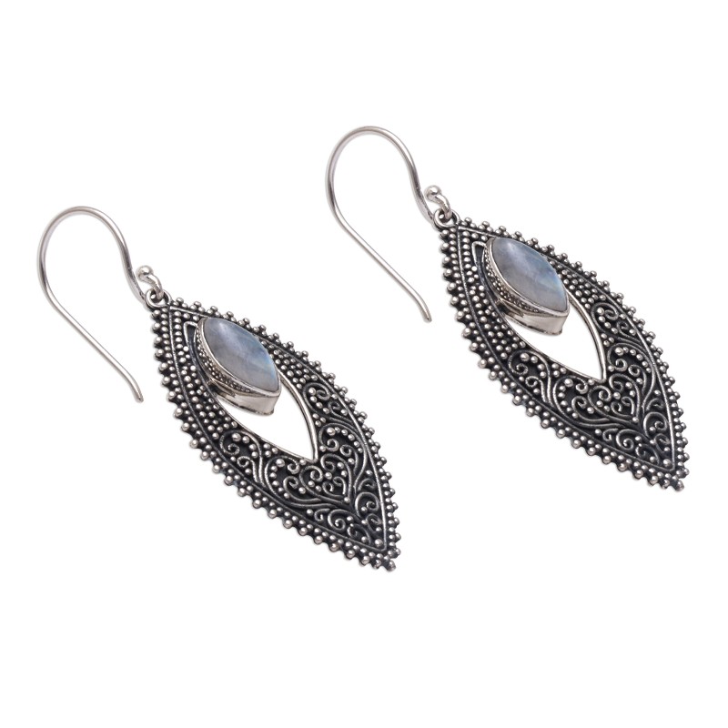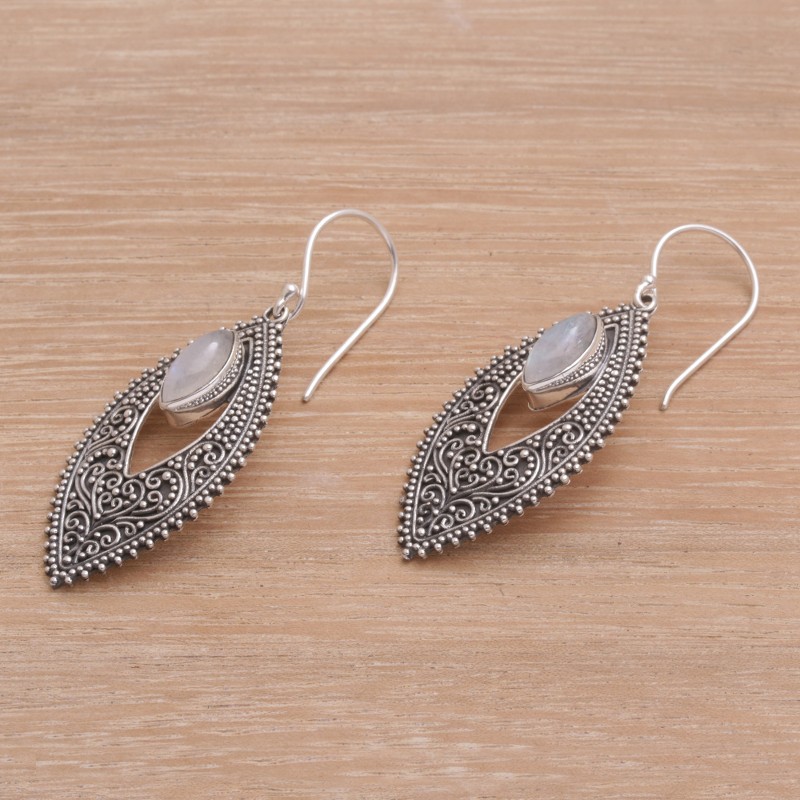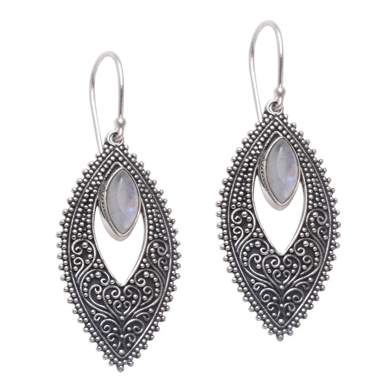 Add a beautifully bold accent to your look with this wonderful pair of dangle earrings from Bali. Each earring is hand crafted by artisan Eki Devi, who decorates the leaf-shaped pendant with traditional Balinese bun and jawan motifs that stand out brilliantly against an oxidized base. Delightful cabochons of rainbow moonstone shimmer from bezel settings at the top, making these earrings an ideal accessory for an elegant look.