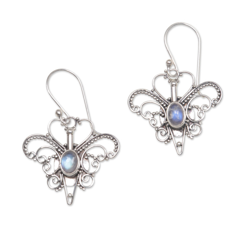 Sterling butterflies alight gracefully on silver wires in a moment of perfect beauty. Crafted by hand, these elegant silver earrings come from Nyoman Rena. They embrace a radiant rainbow moonstone, considered a lucky love stone.