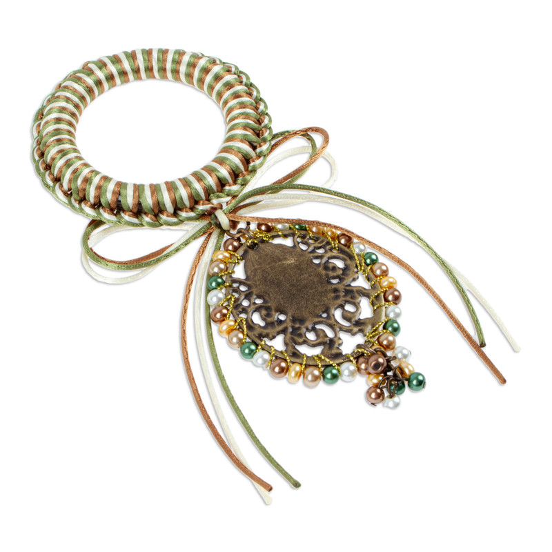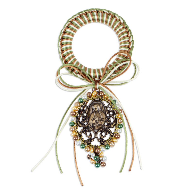 A palette of green, brown and ivory hues evokes Our Lady of Guadalupe's harmonious essence. Artisan Mony Lemus of Mexico celebrates faith and hope with this door knob hanger, adorned with polyester ribbons, shiny glass beads and an antiqued zamac metal medallion.